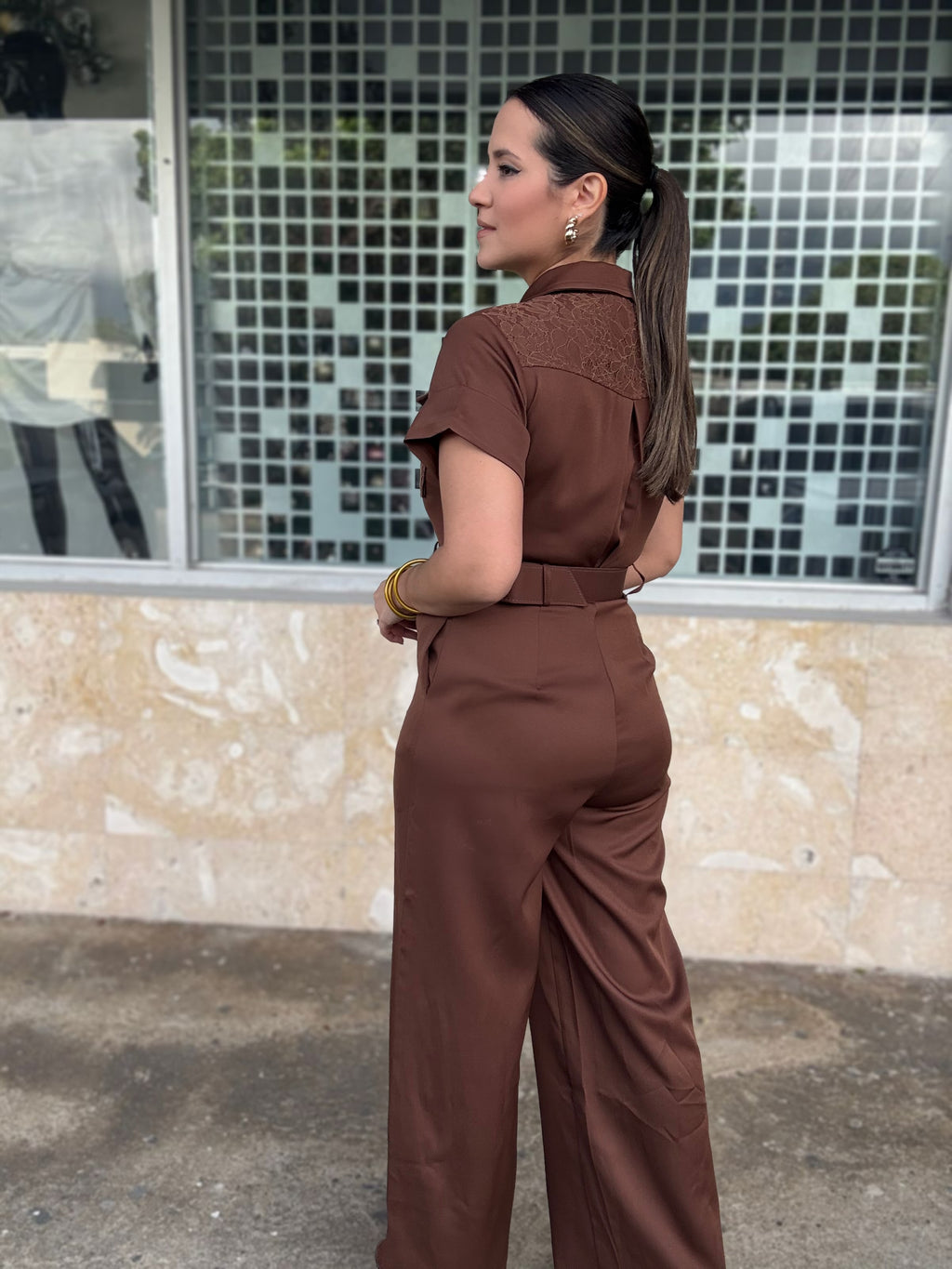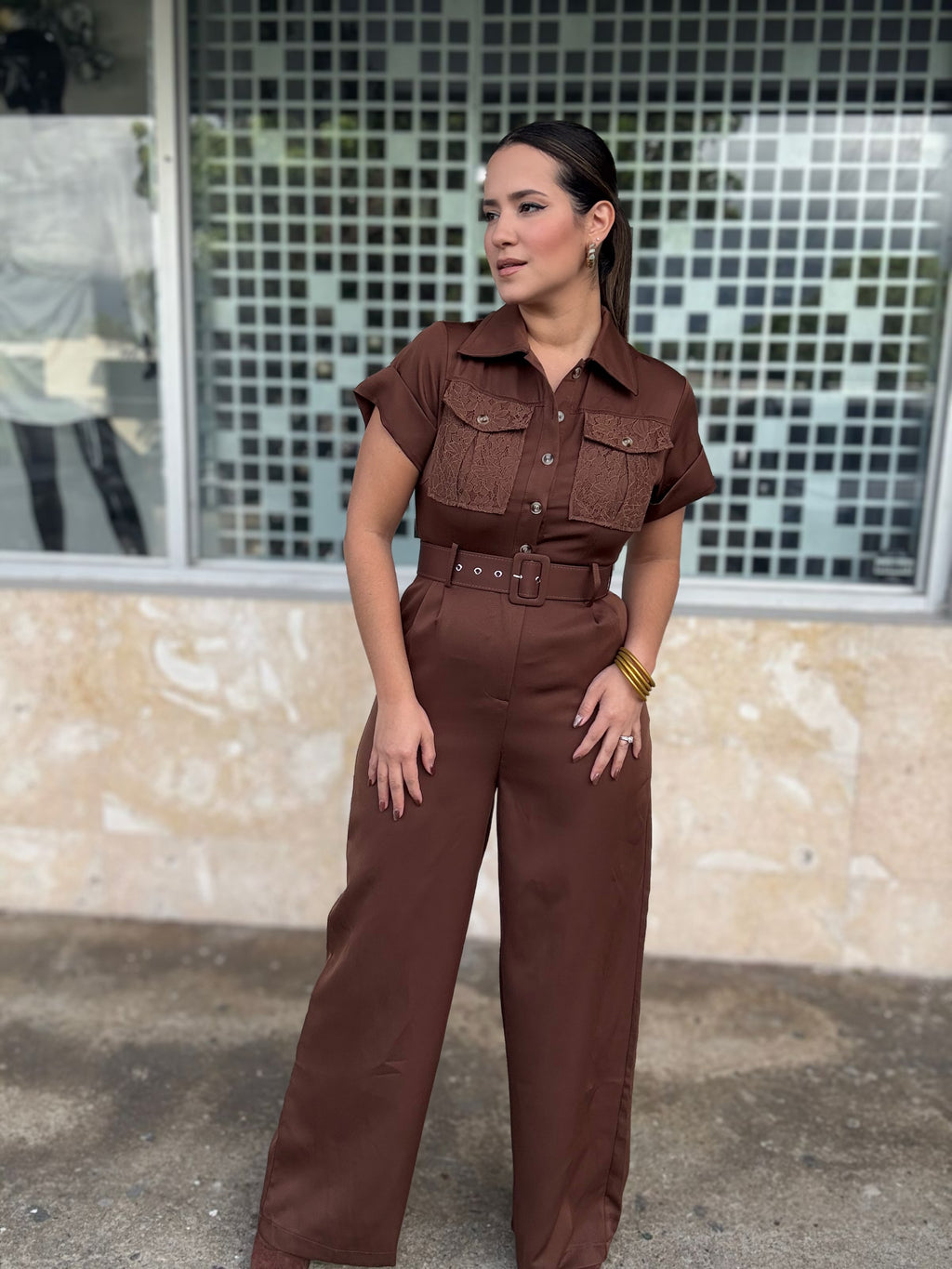 Lace Pockets Brown Jumpsuit