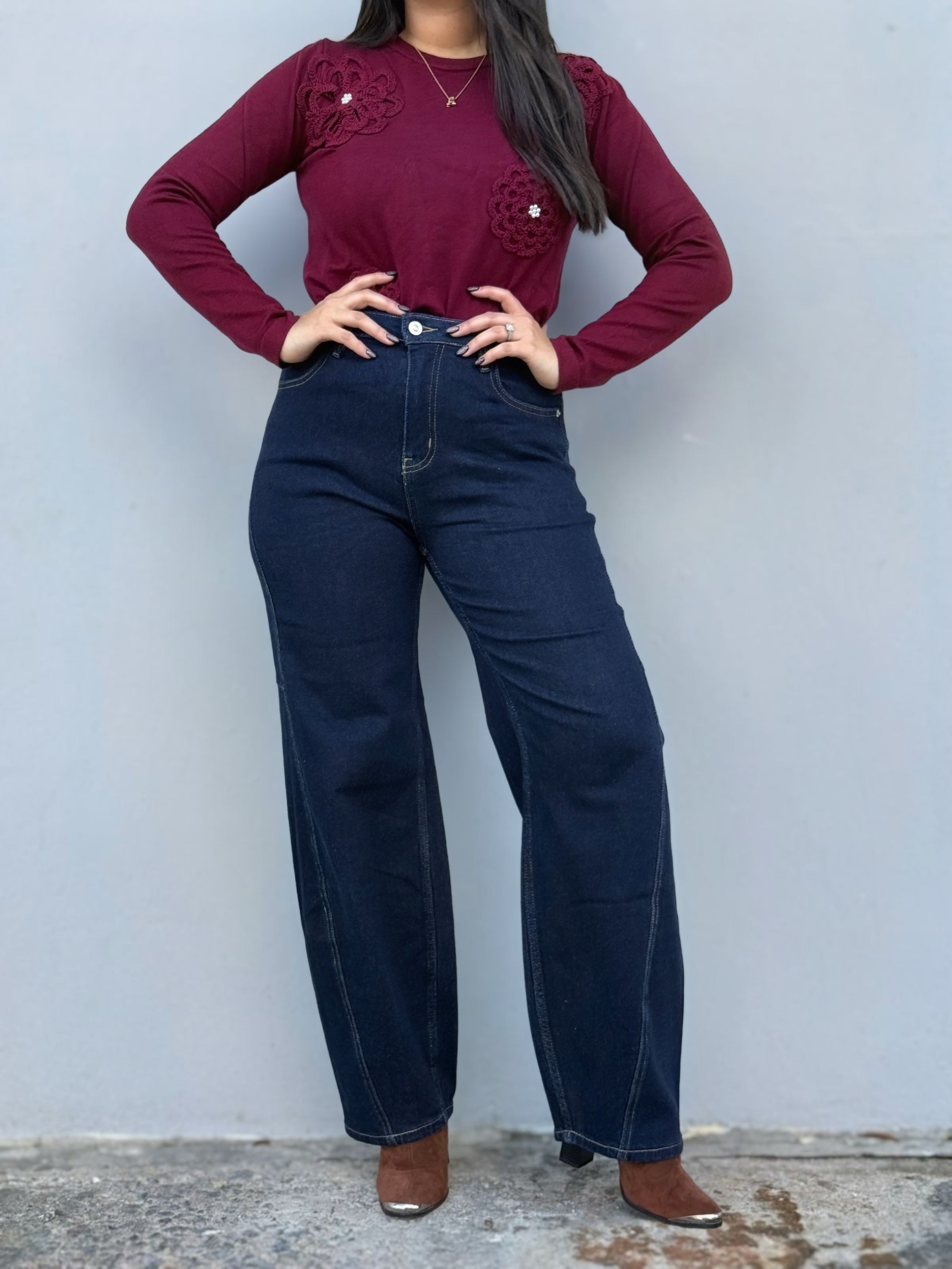 Jean mahón azul oscuro en tela spandex con estilo barrel, cierre de zipper y botones en centro. Súper high waisted, alto en cintura. Corre al size. Modelo usa talla small.