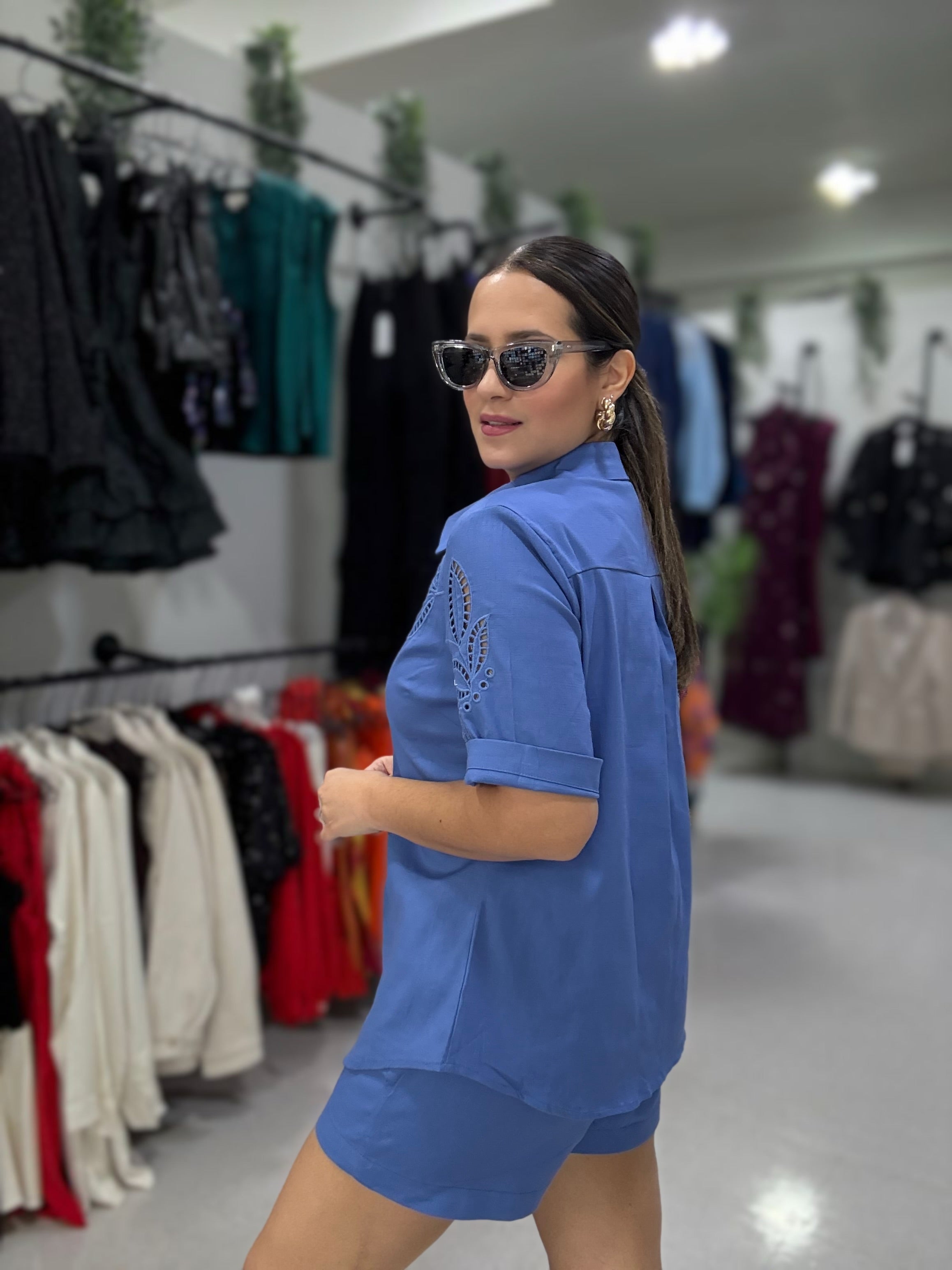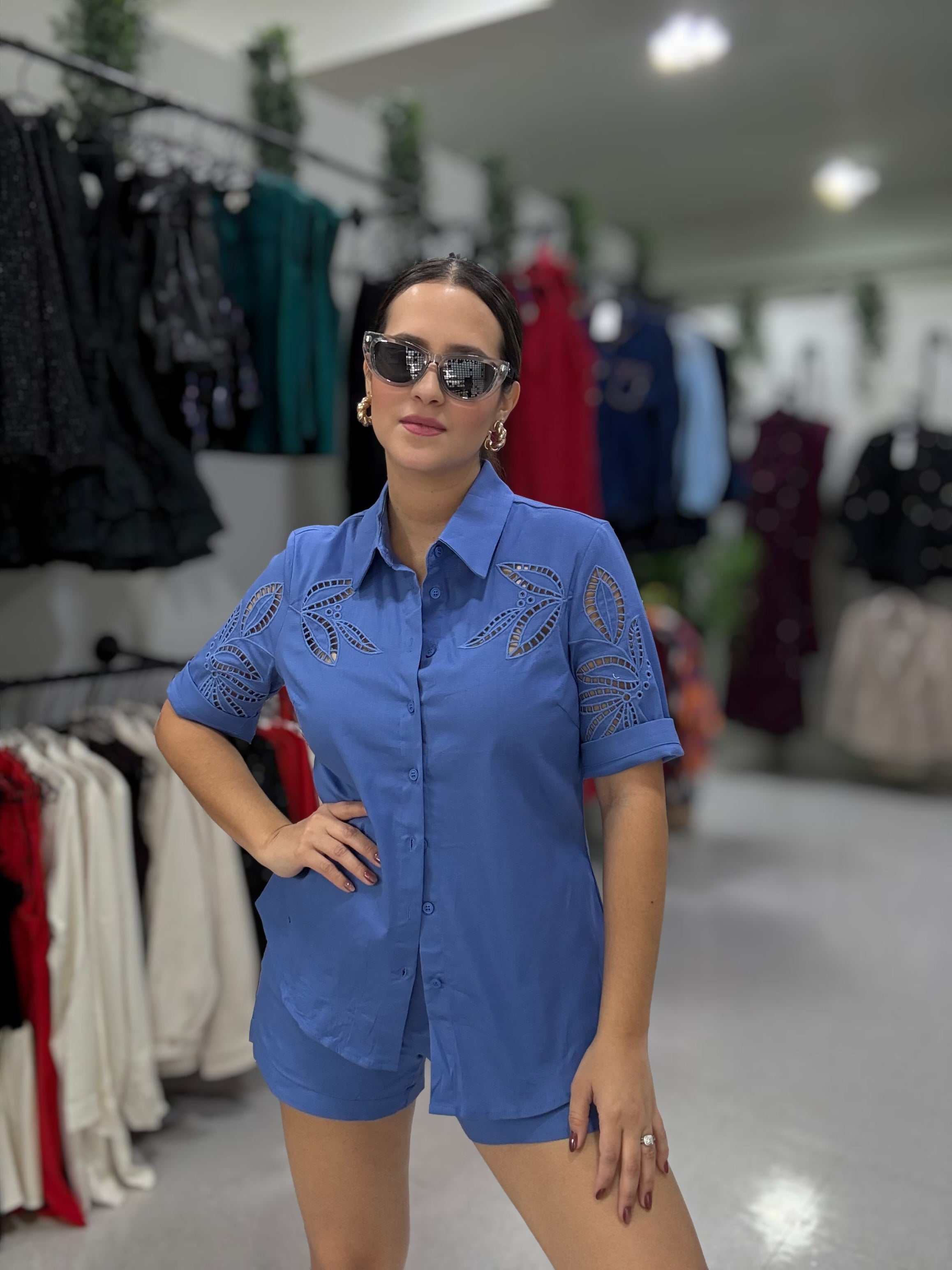 Set corto azul, de dos piezas. Camisa de botones en centro con bordado en centro de la blusa y mangas. Dobladillo en las mangas, largo a la cadera. Pantalon corto con elastico en cintura y bolsillos en las caderas. Tela algodon con spandex. Corre al size. Modelo usa talla small.