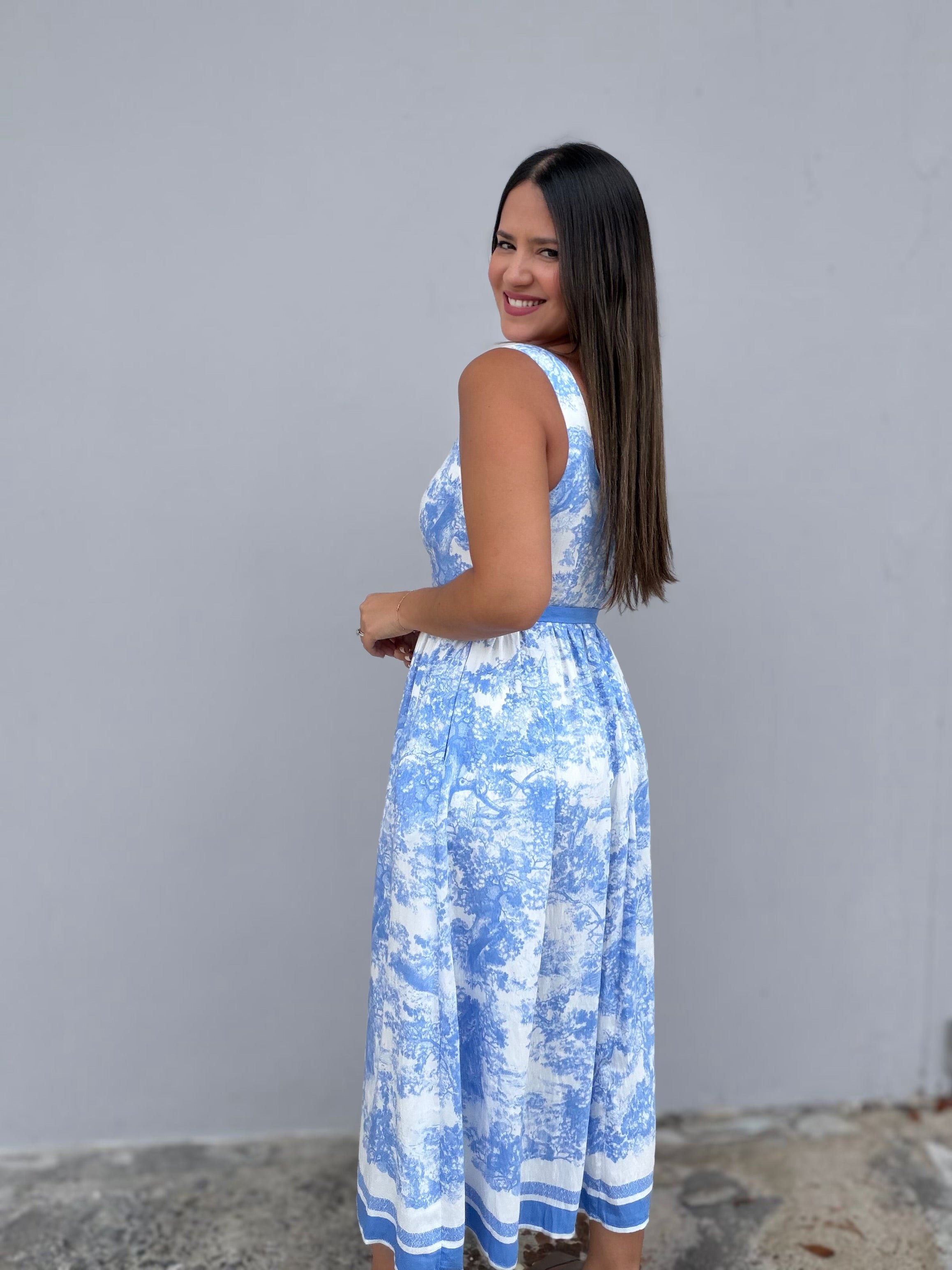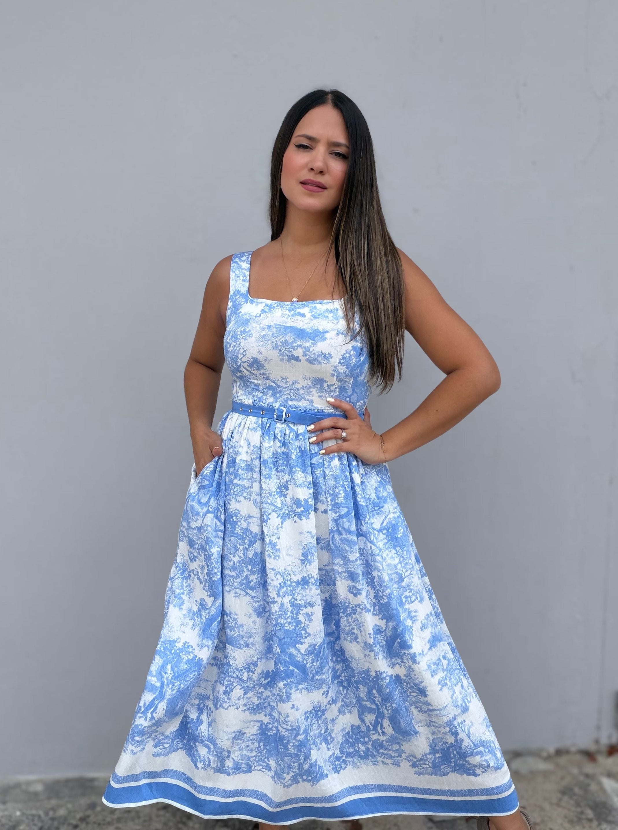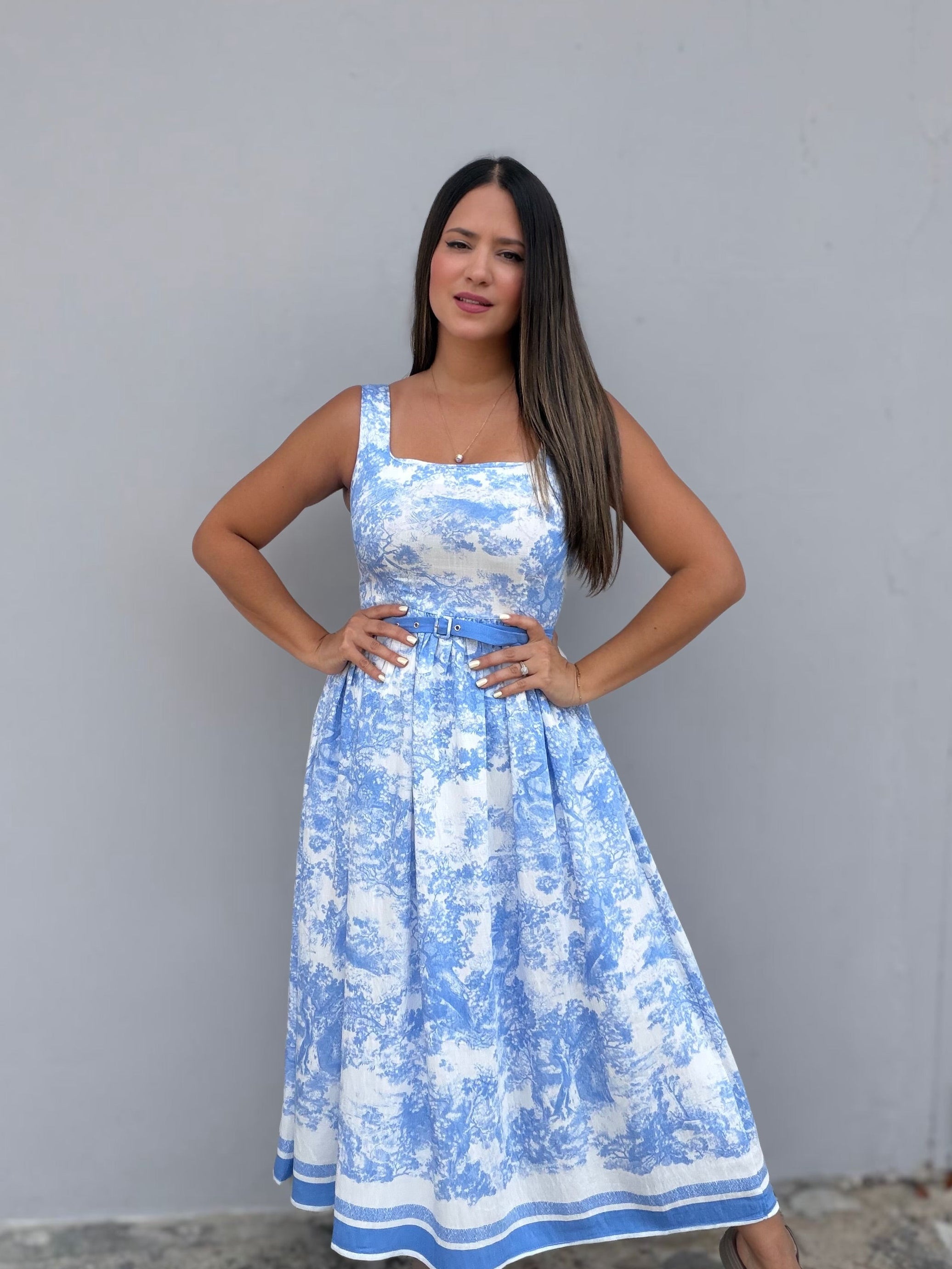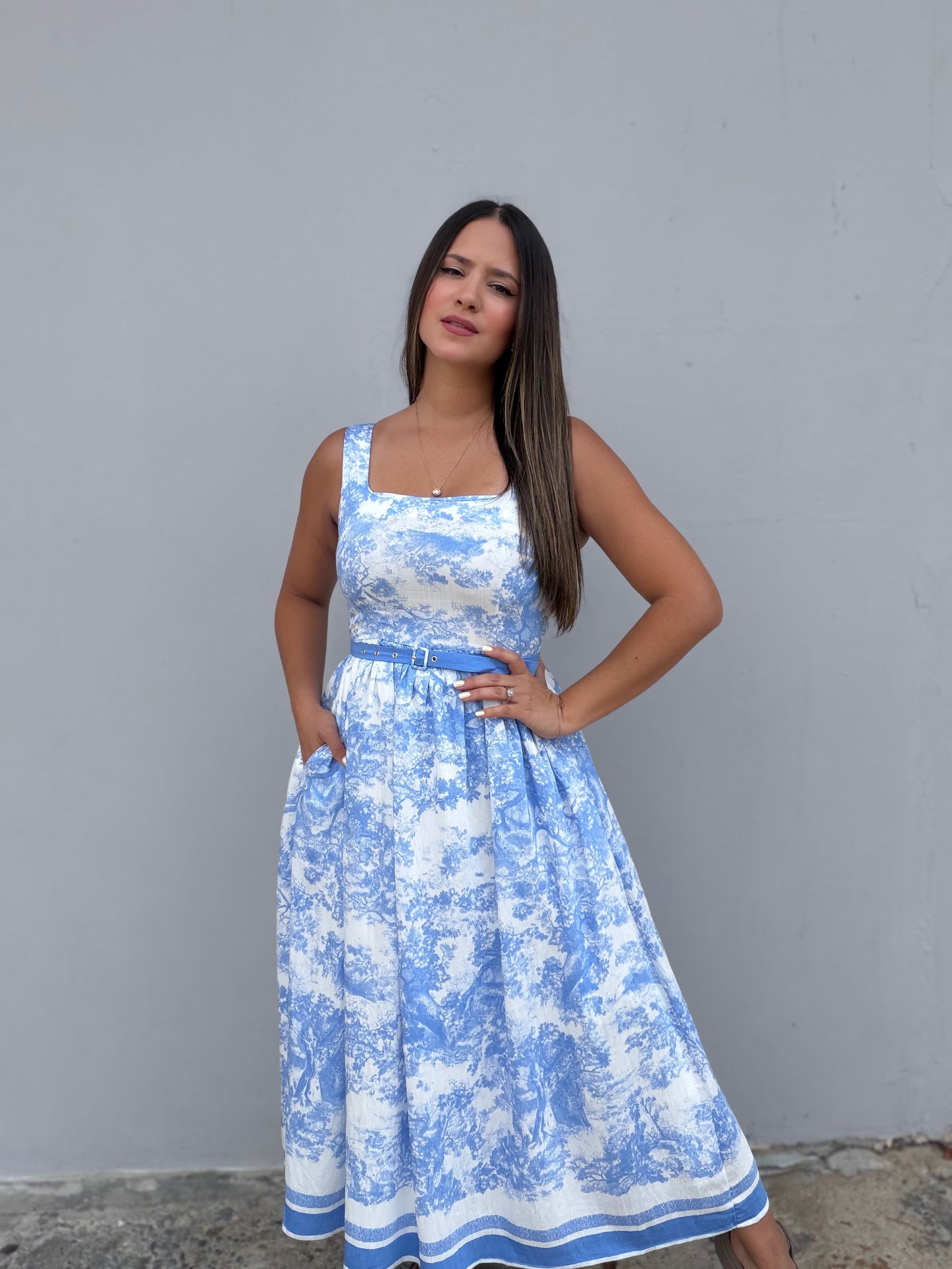 Traje midi en estampado azul con base blanca. Corte en cintura y cinturon incluido. Cierre de zipper invisible en espalda. Corre al size. Modelo usa talla small.