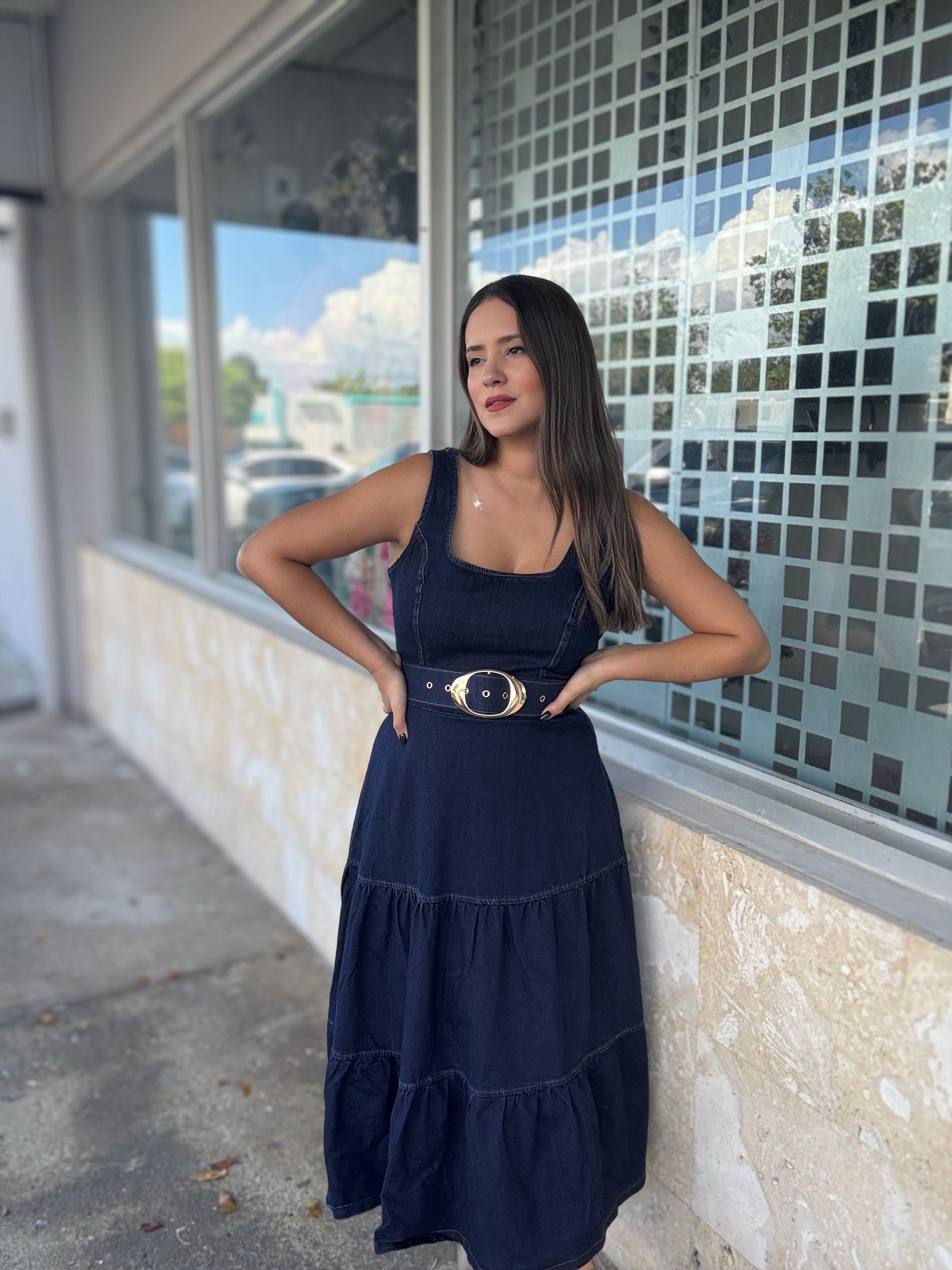 Traje tipo denim en color azul oscuro y tela spandex con Correa ancha en cuero y hebilla dorada, ajustable. Cierre de zipper en costado, largo del vestido midi. Corre al size. Modelo usa talla small.