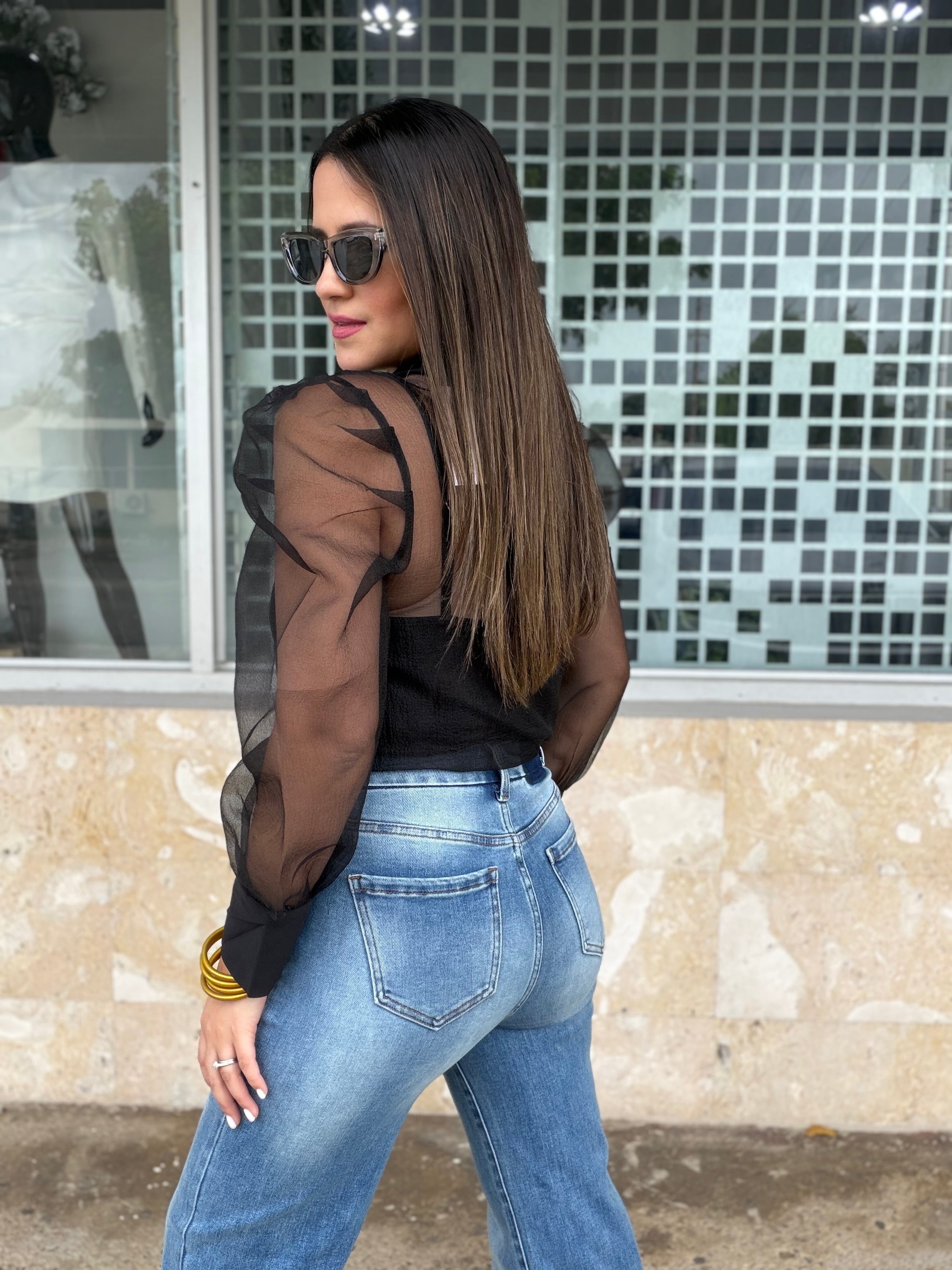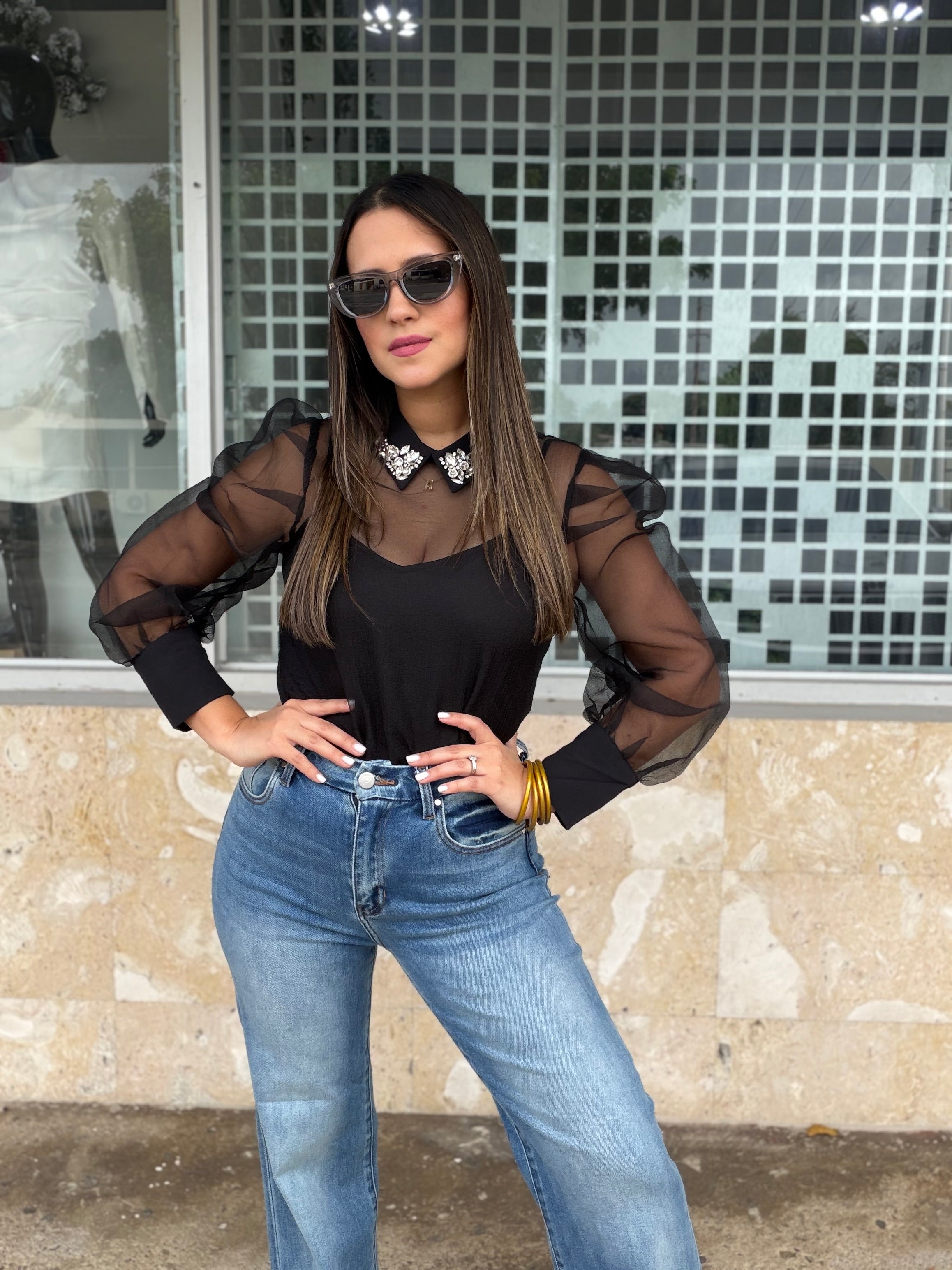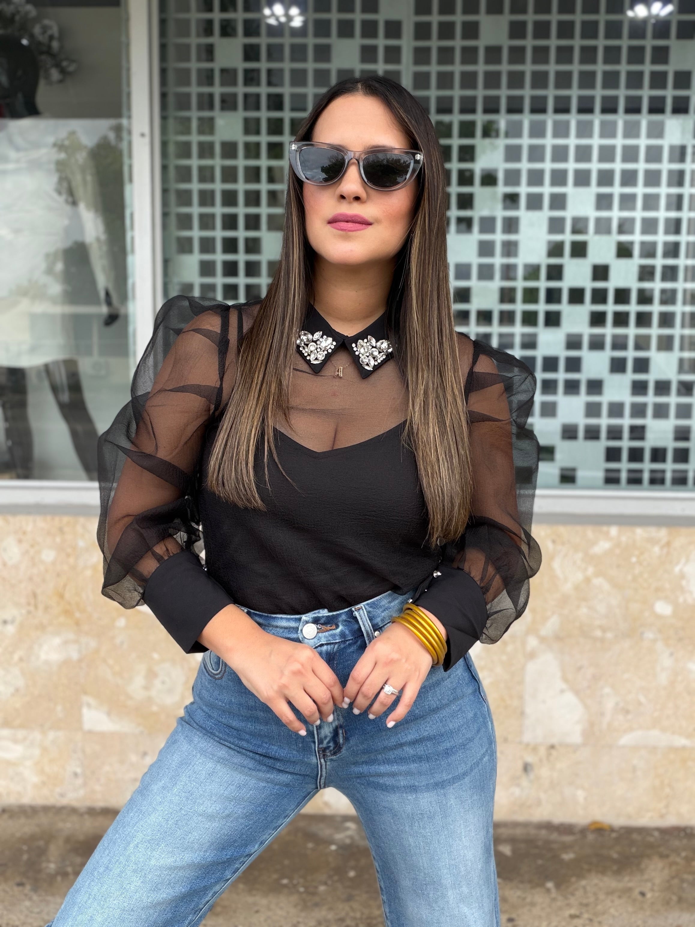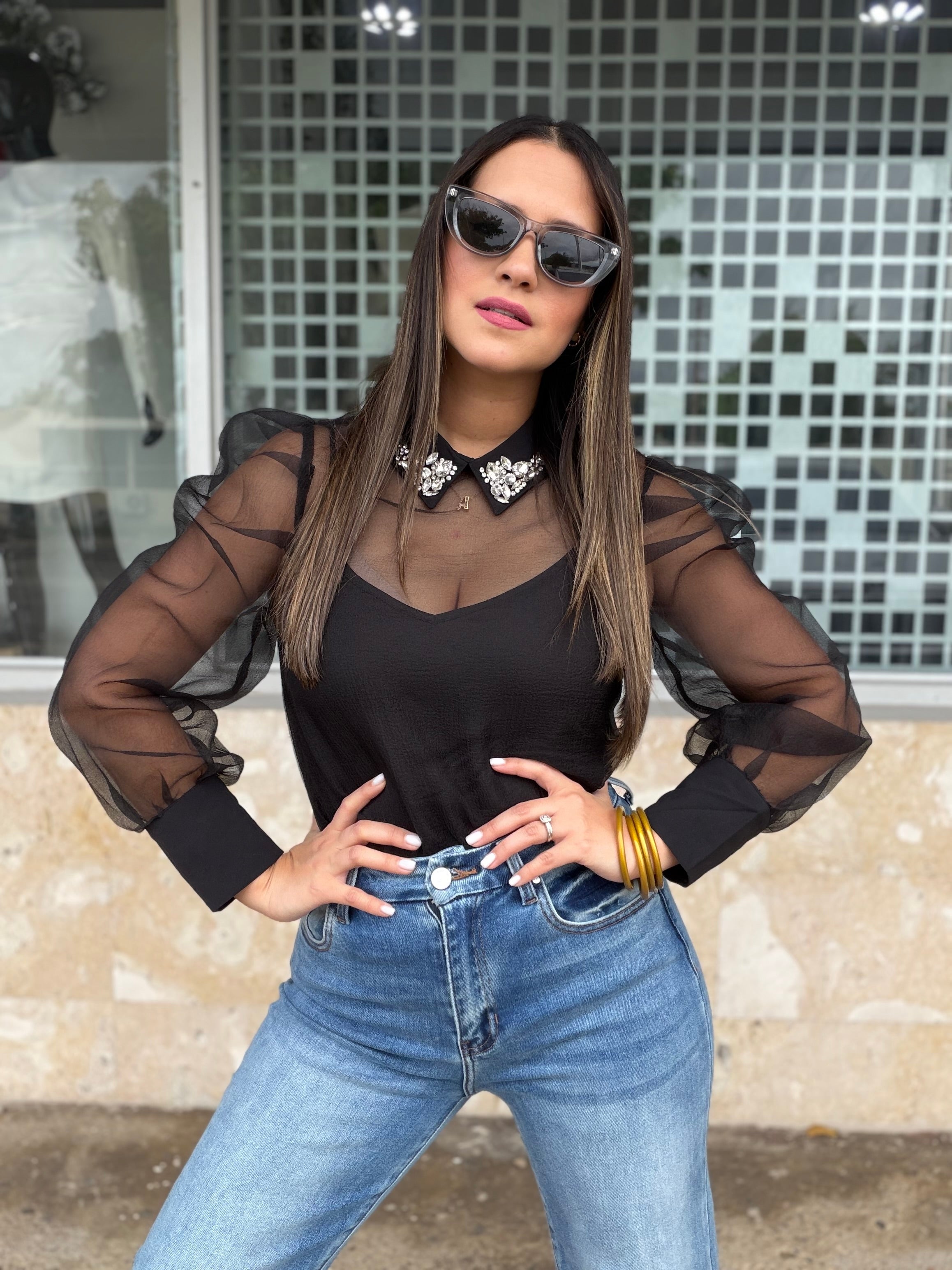 Blusa negra en mesh transparente, con diseño elegante y femenino. Presenta mangas largas abullonadas en tela sheer que aportan sofisticación y un toque moderno. El cuello camisero está adornado con aplicaciones tipo pedrería, convirtiéndola en una pieza protagonista sin perder elegancia.