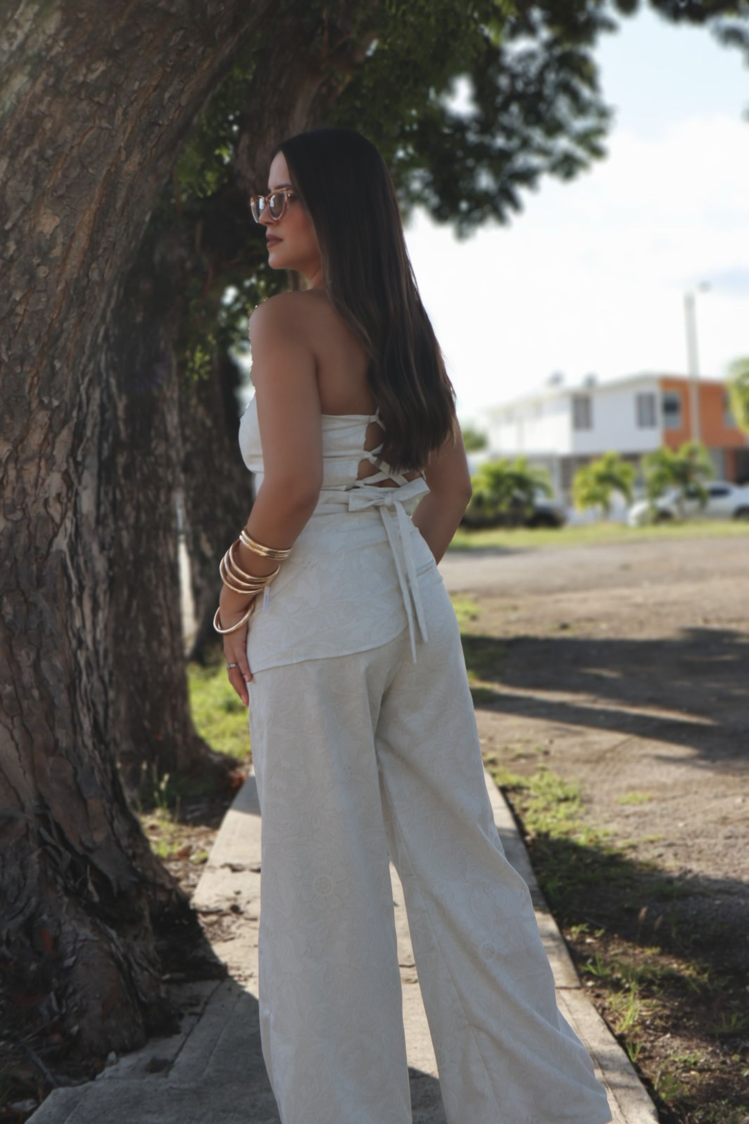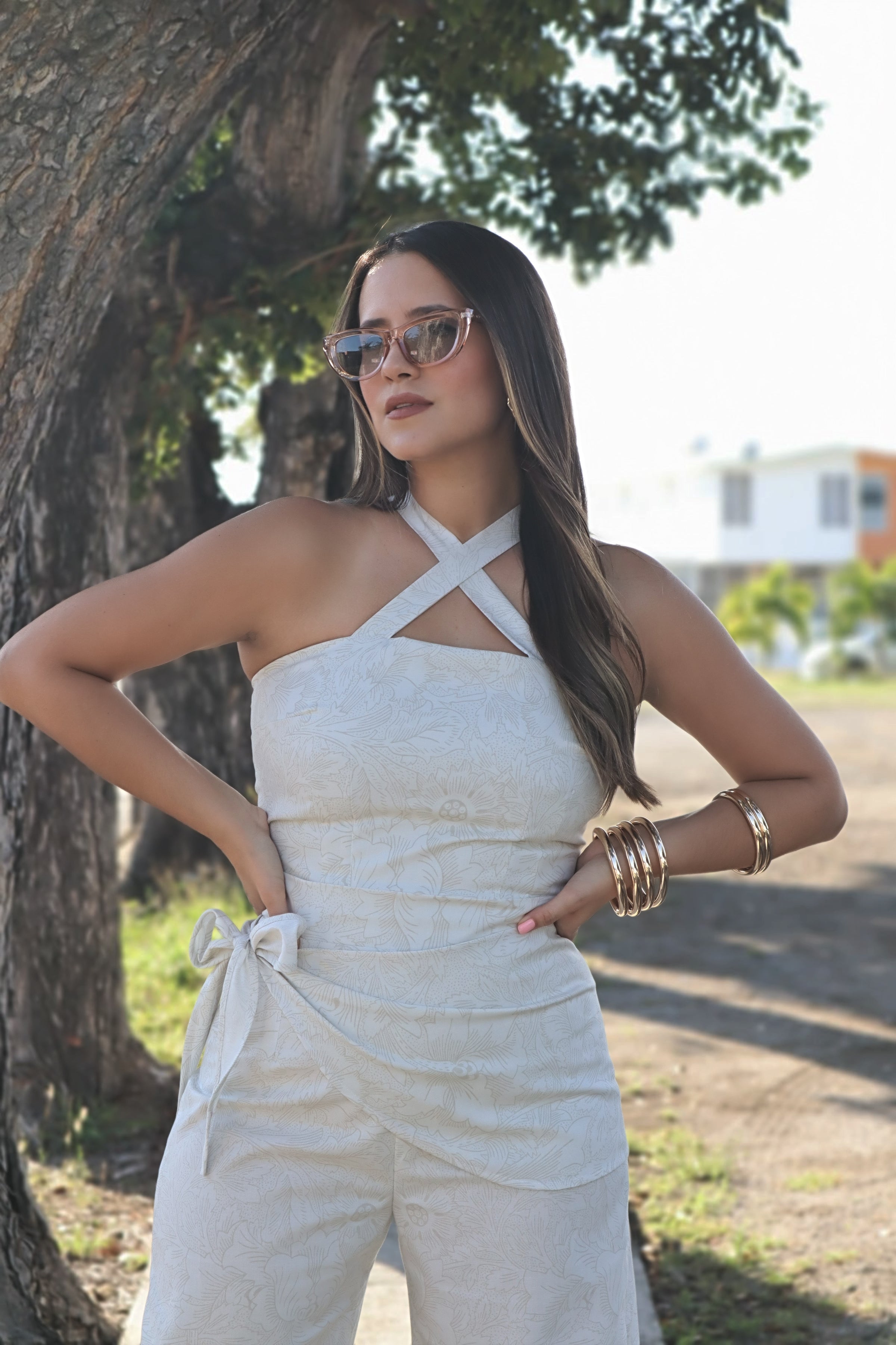 Crop top en tono neutro con diseño sofisticado y femenino que resalta por su escote halter cruzado y espalda ajustable. Una pieza moderna y versátil que define la silueta y eleva cualquier look con elegancia minimalista. (El pantalón se vende por separado).