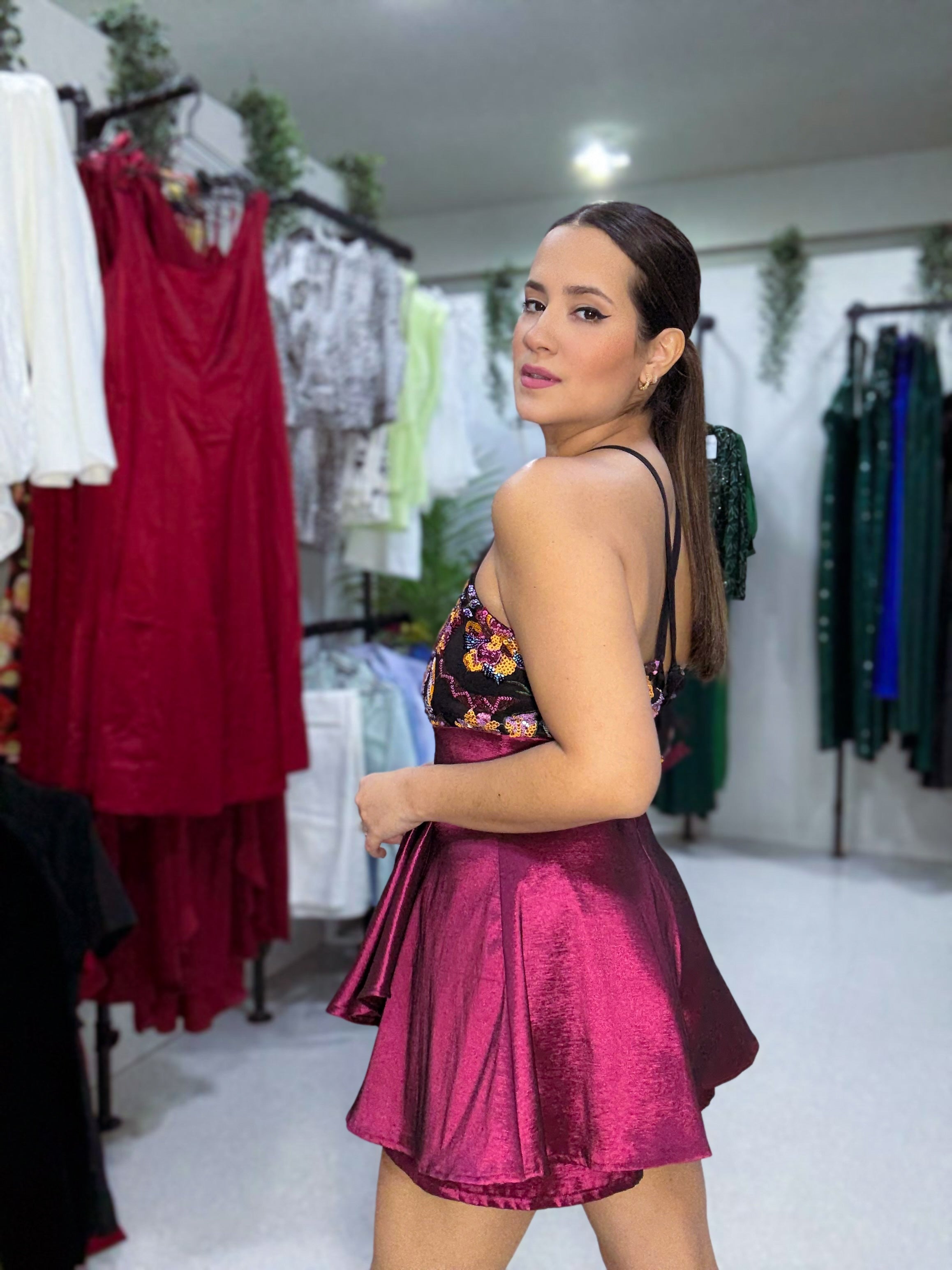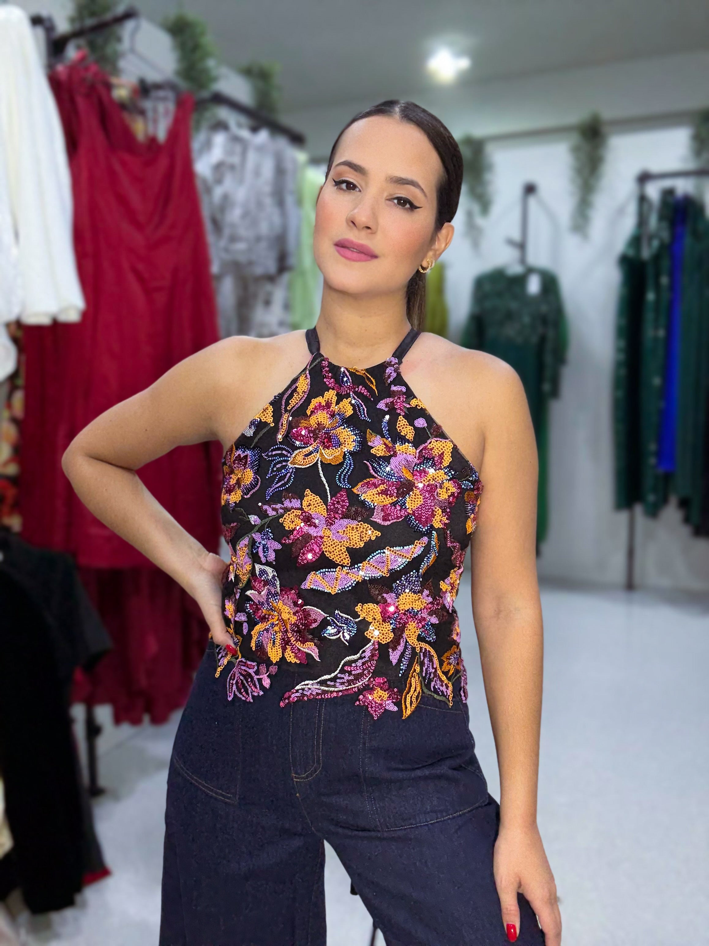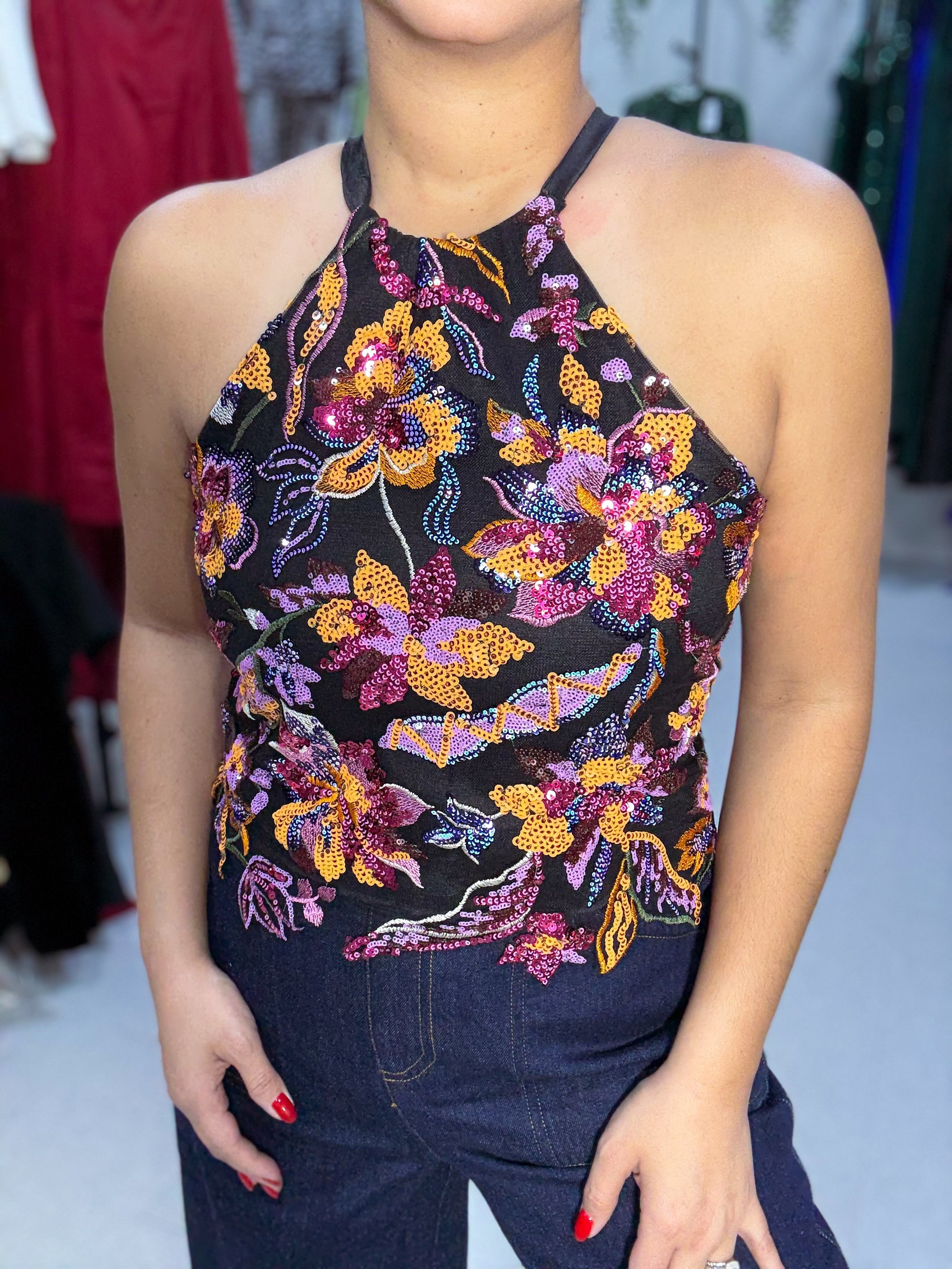 Blusa bordada en lentejuelas, canutillos y piedras con diseños en flores y hojas multicolor entre dorado, azul, magenta y color vino. Fondo en "taffeta spandex" negro con "straps" que vienen desde el cuello hasta la espalda ajustables con banda fina que estira.