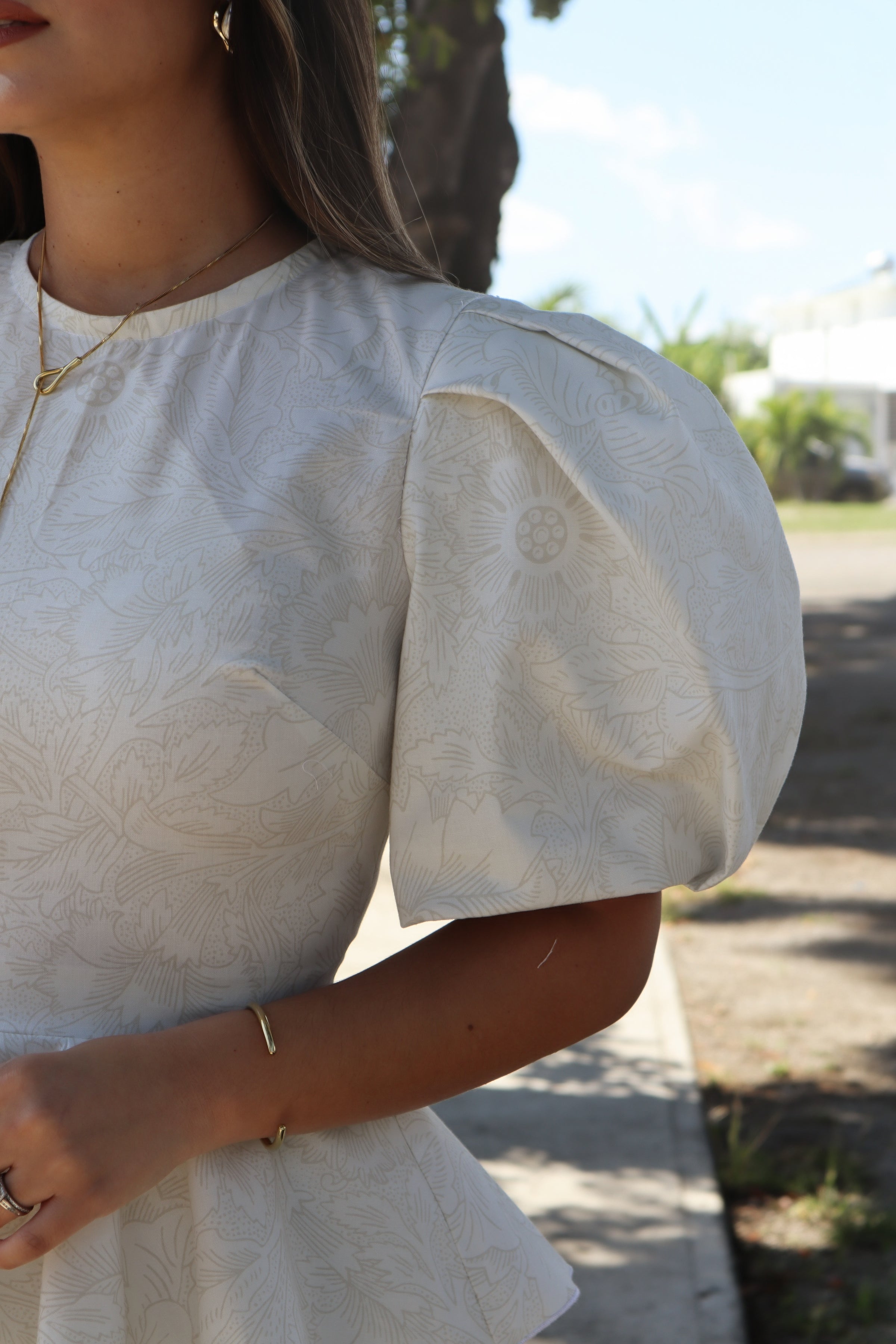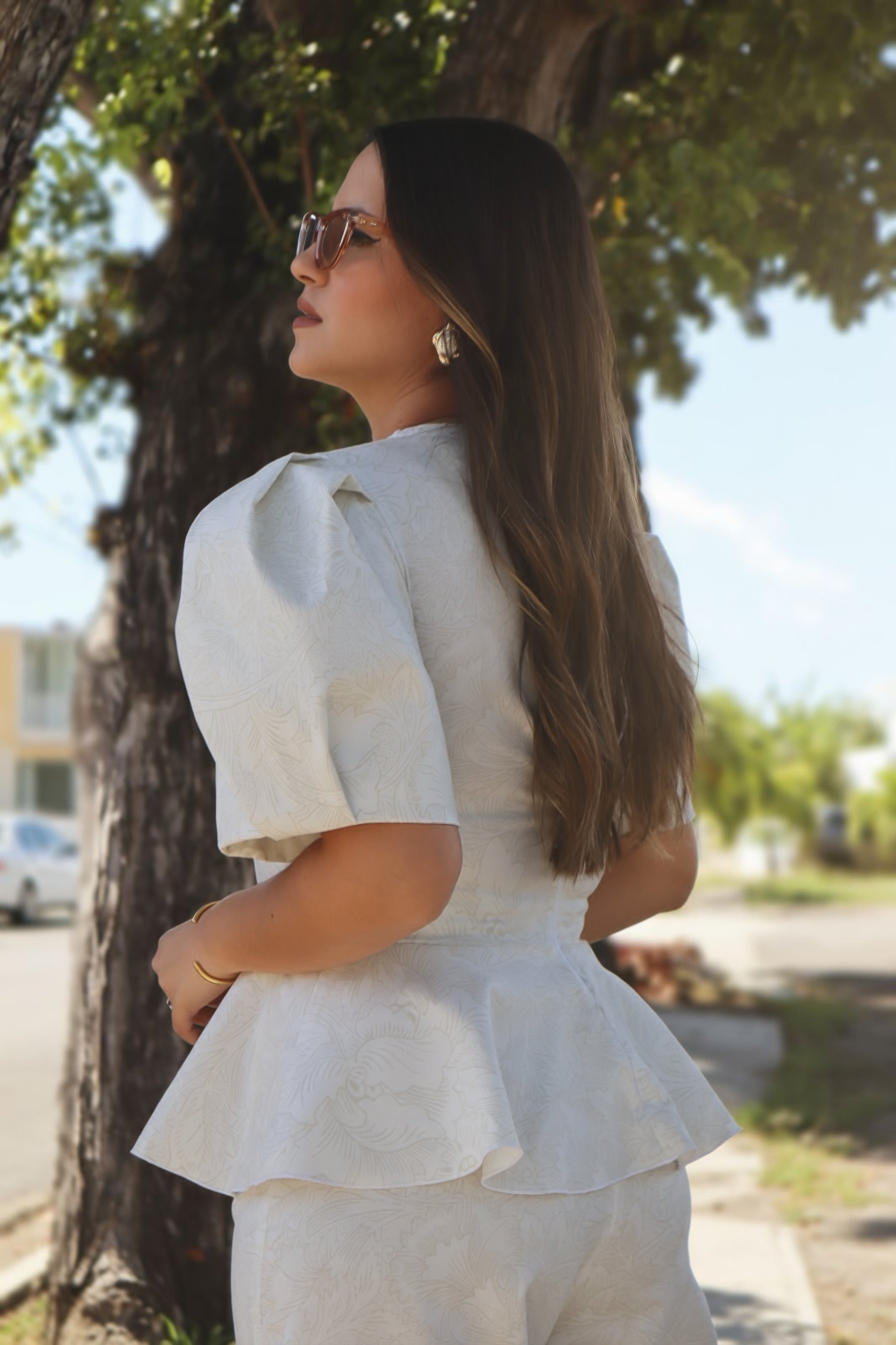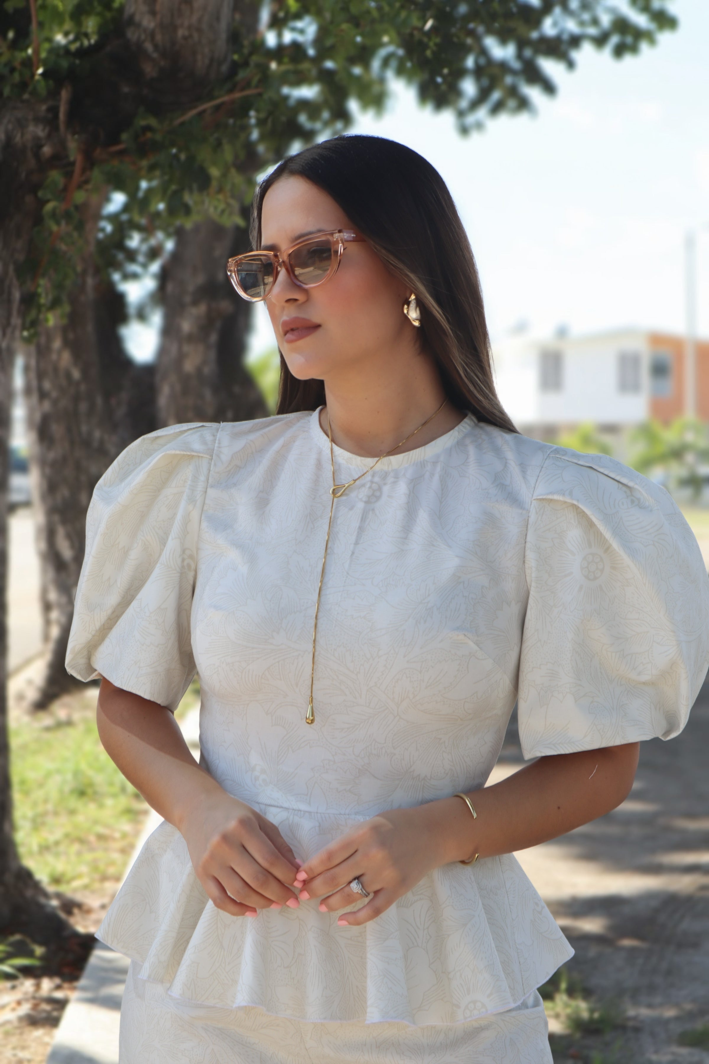 Pieza elegante confeccionada en tela 100% algodón, fresca y cómoda. Su silueta estructurada con mangas voluminosas y peplum en cintura crea una forma femenina y sofisticada. Incluye cierre de zipper invisible y botón en la espalda para un acabado limpio y pulido.