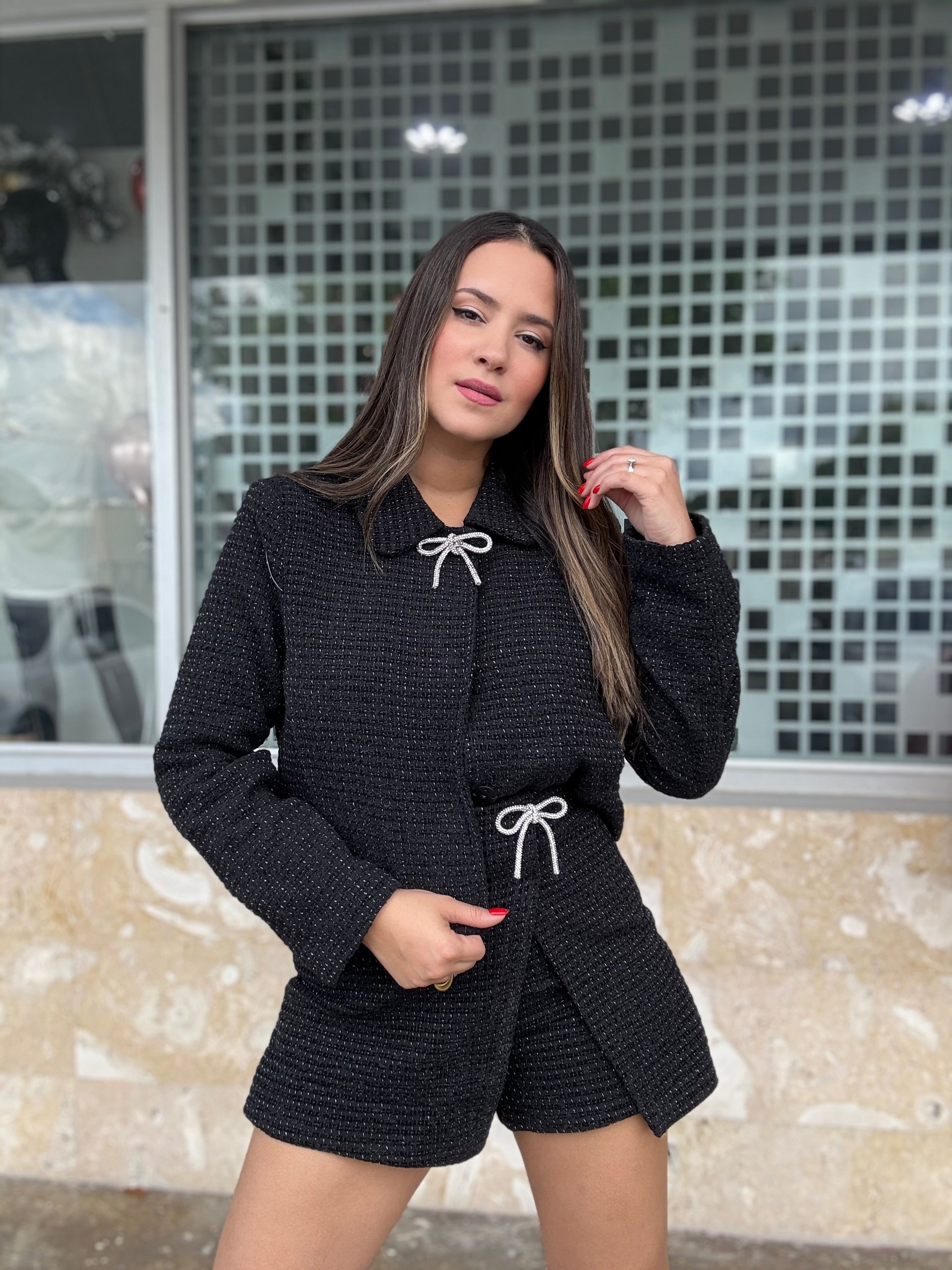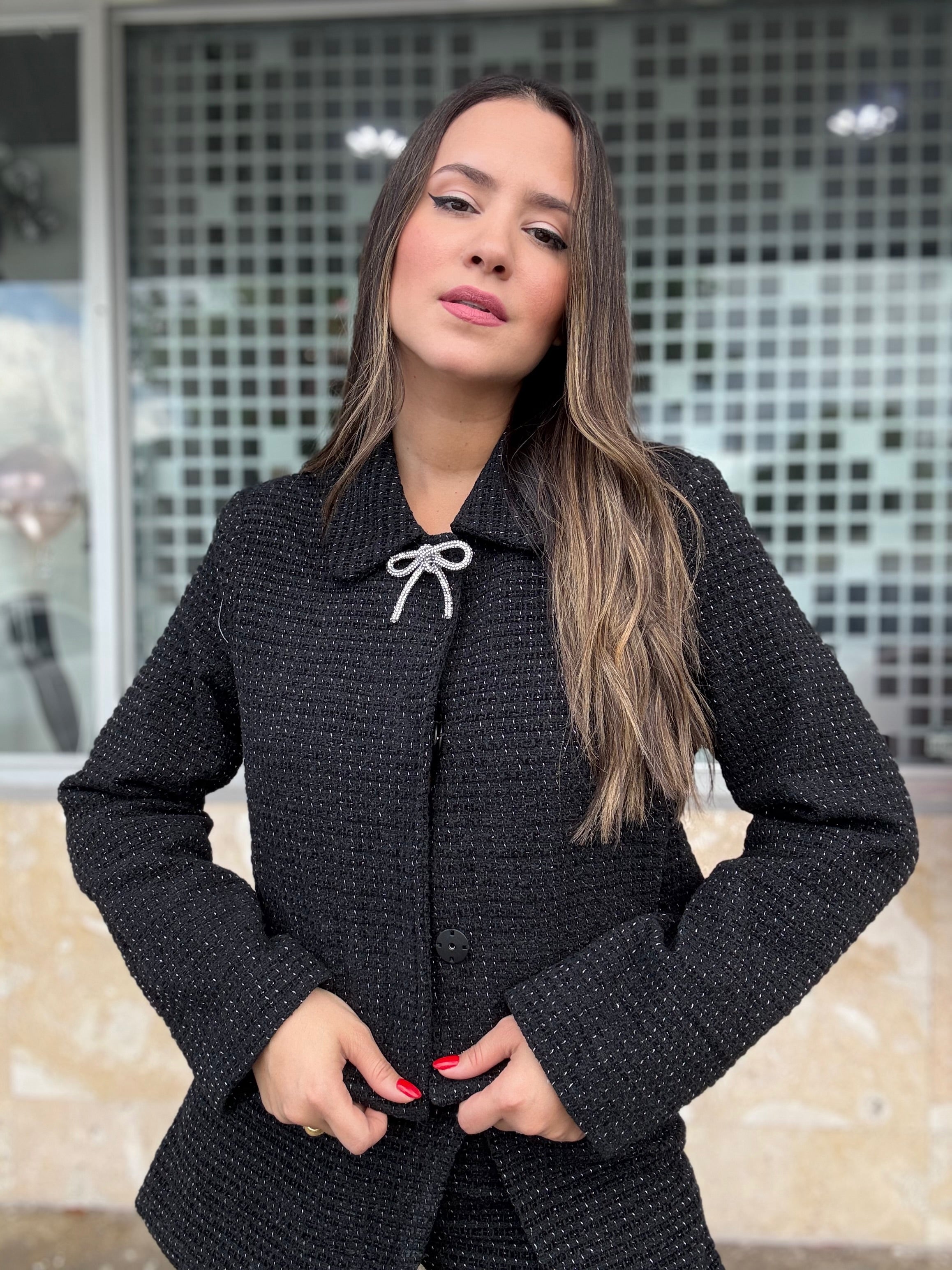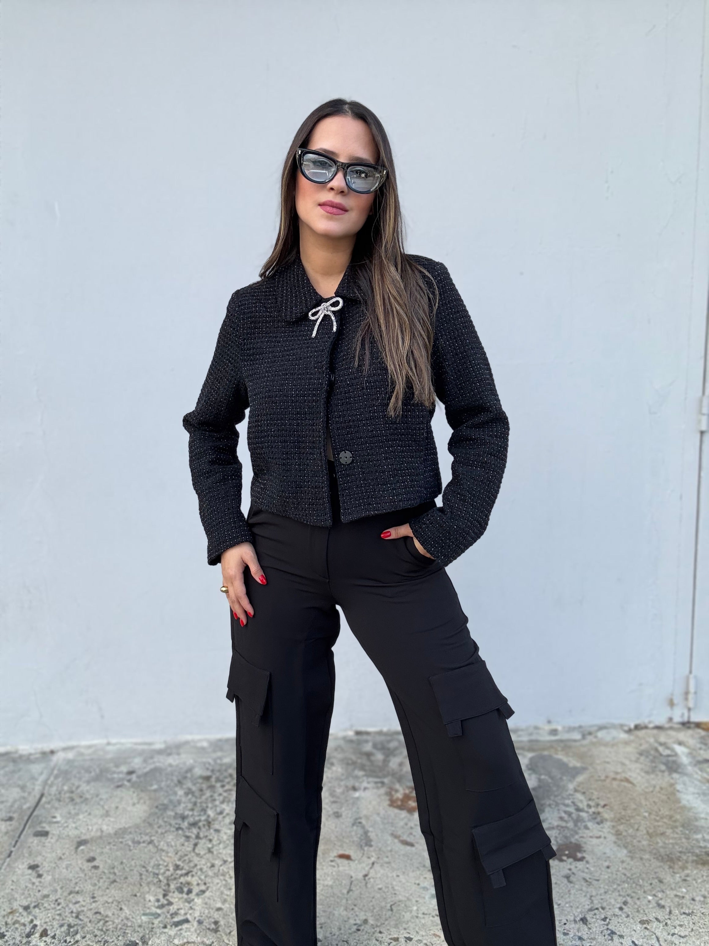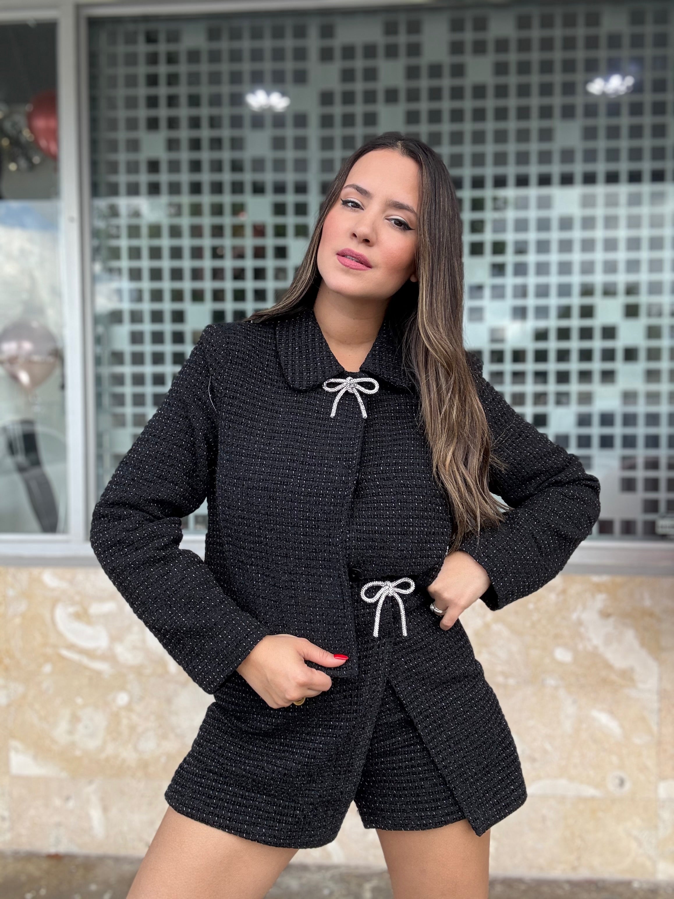 Black Tweed Bow Short Blazer