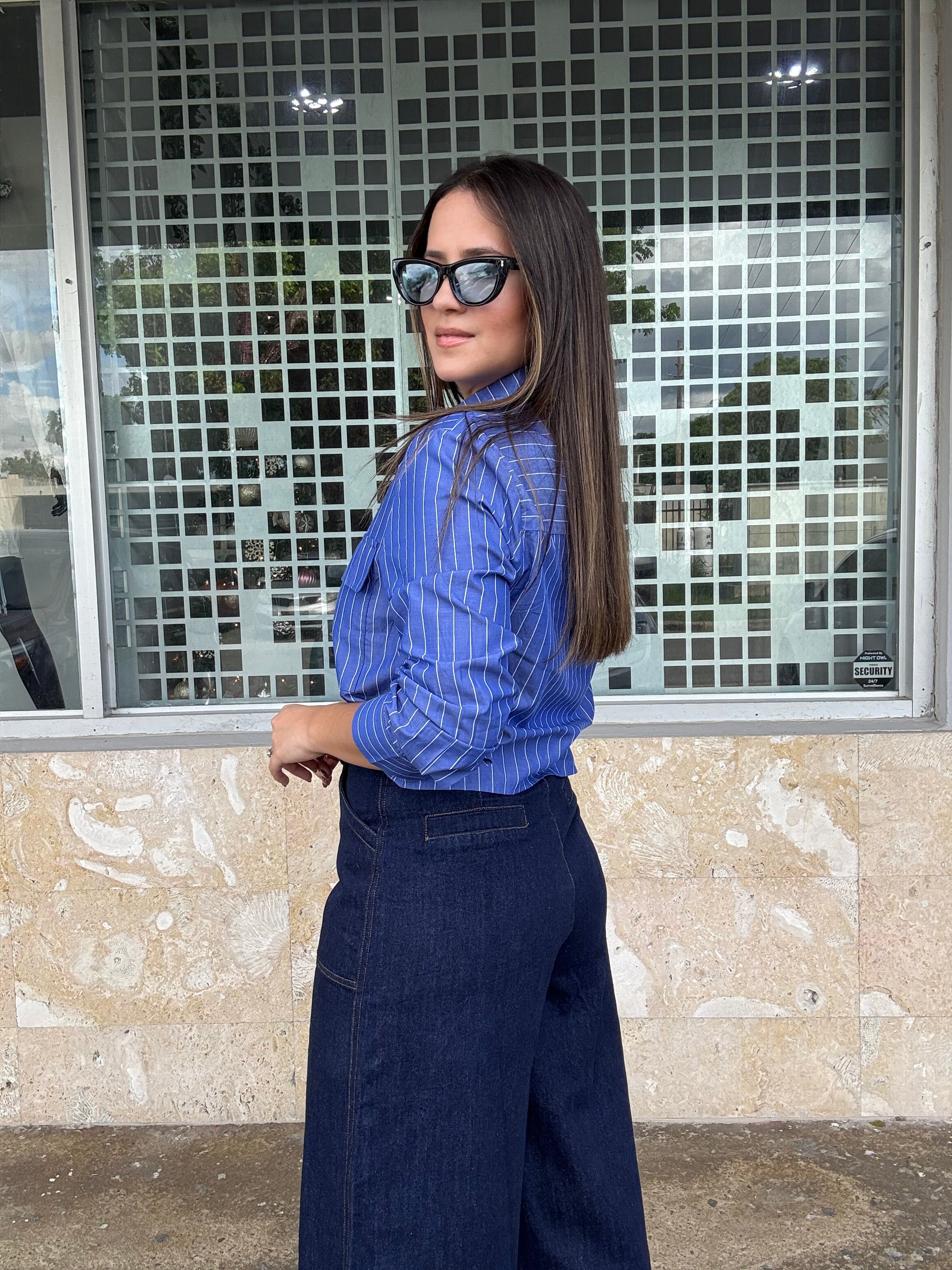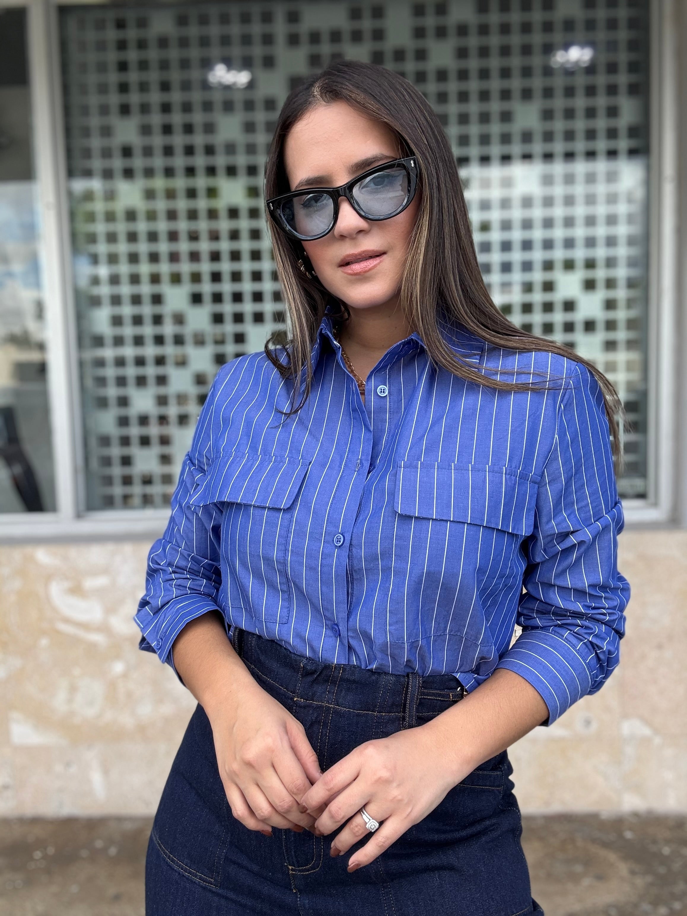 Blusa manga larga en color azul y blanco con diseño en rayas. Bolsillos en el frente y botones de cierre en centro y puños de la manga. Corte largo hasta la cadera alta. Corre al size. Modelo usa talla small