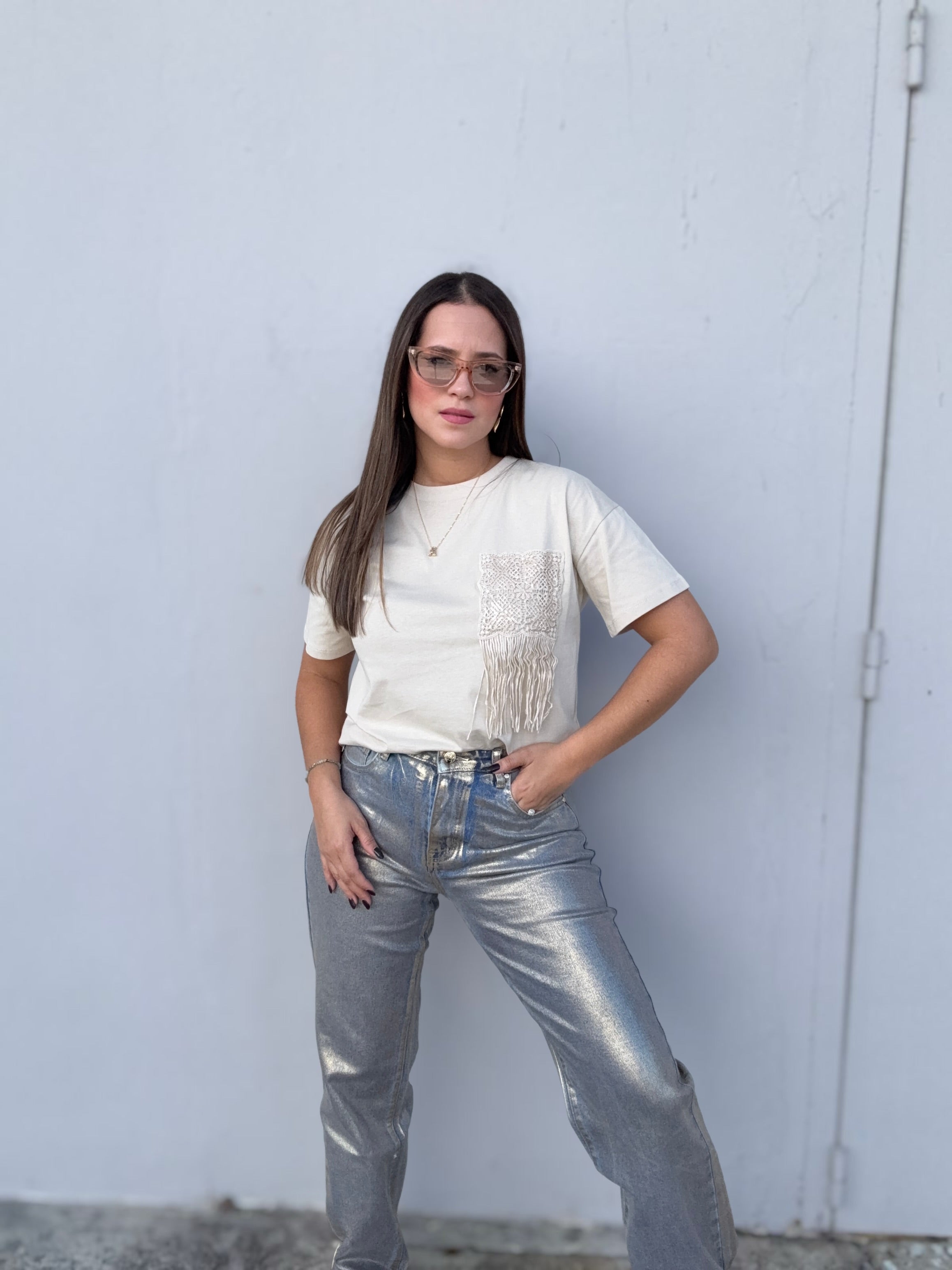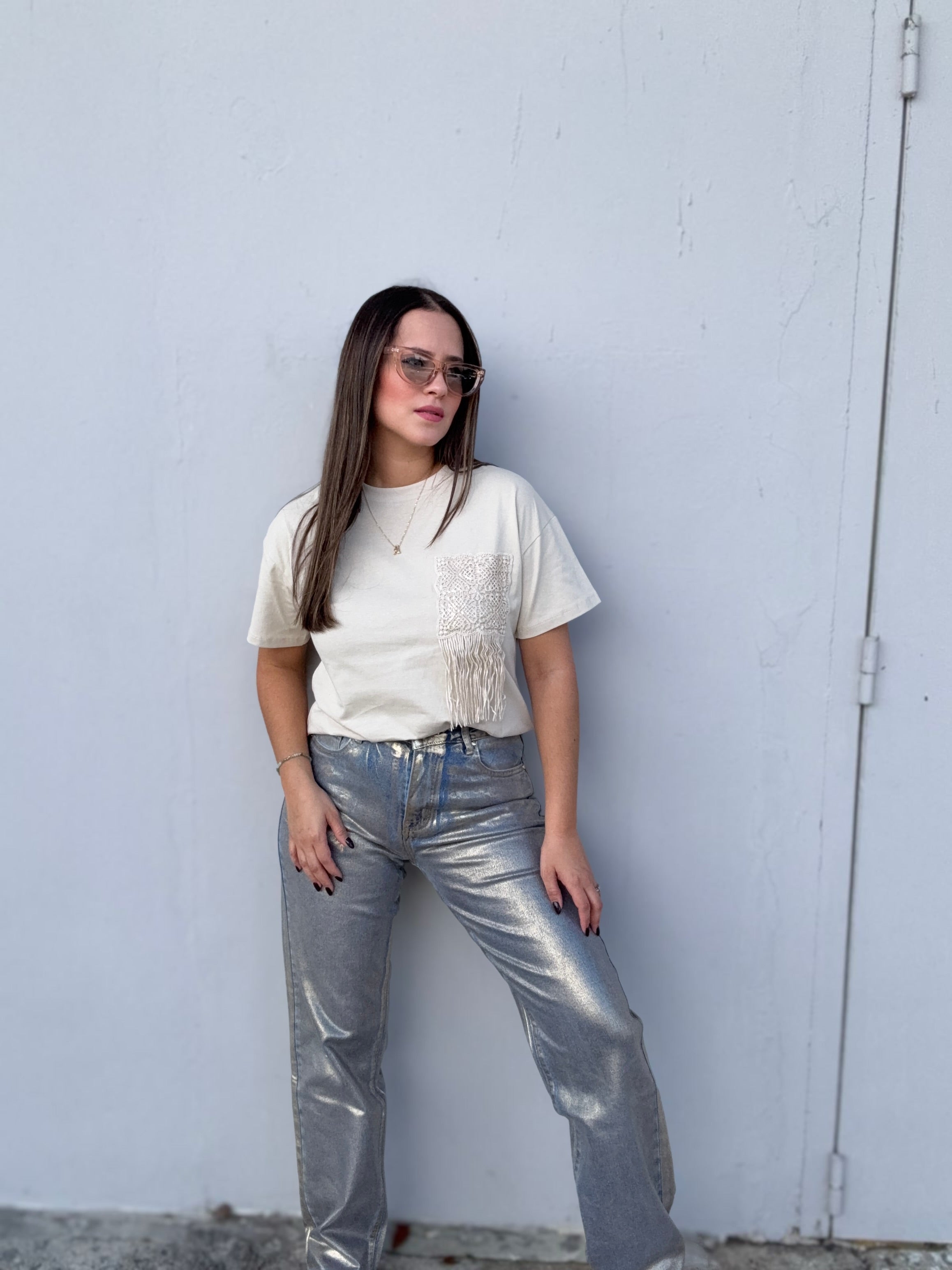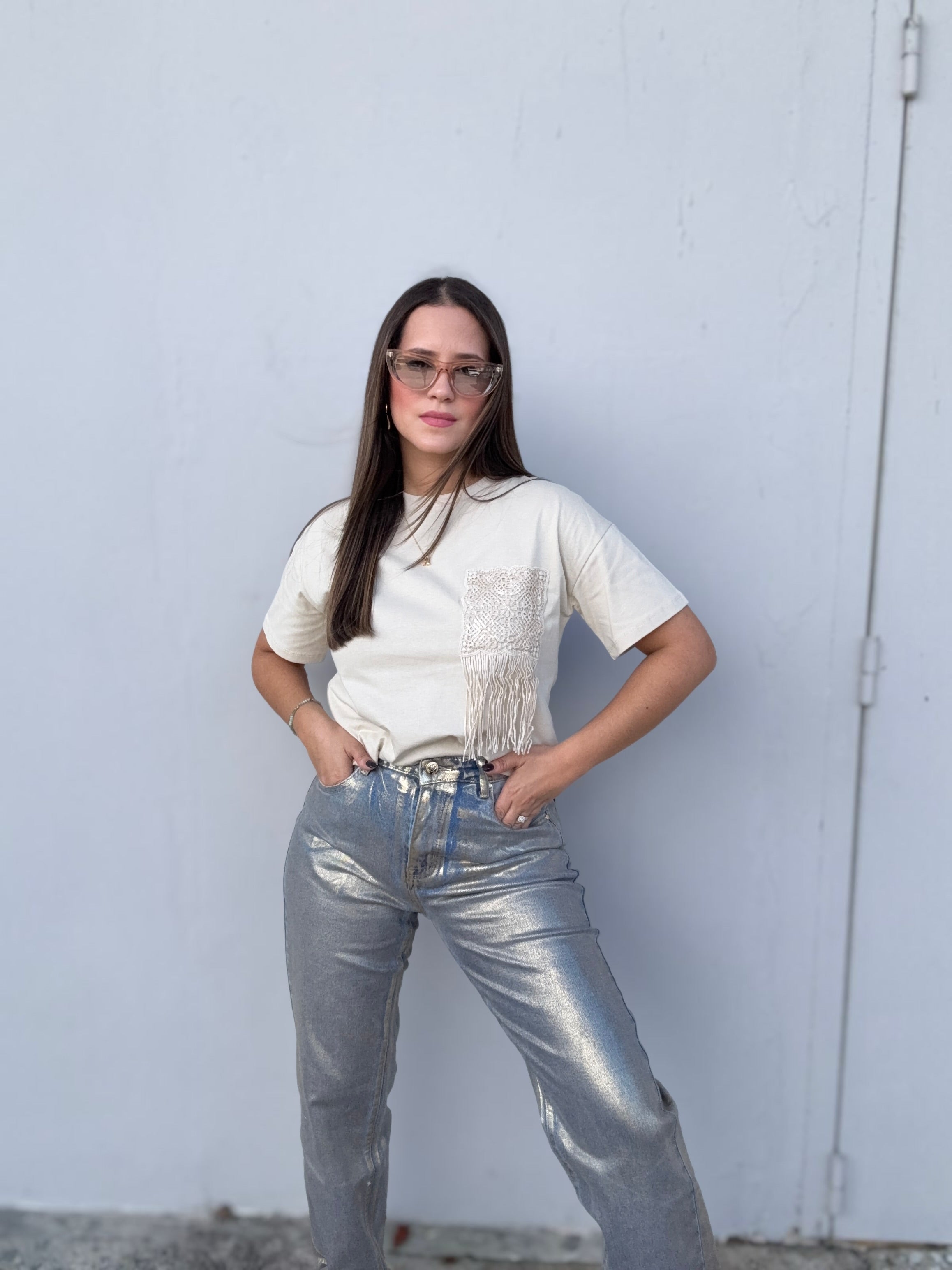 Jean en base azul clara con tope metalico en color oro. Estilo high waisted con cierre de zipper y boton. Tela spandex denim. Corre al size, modelo usa talla medium.