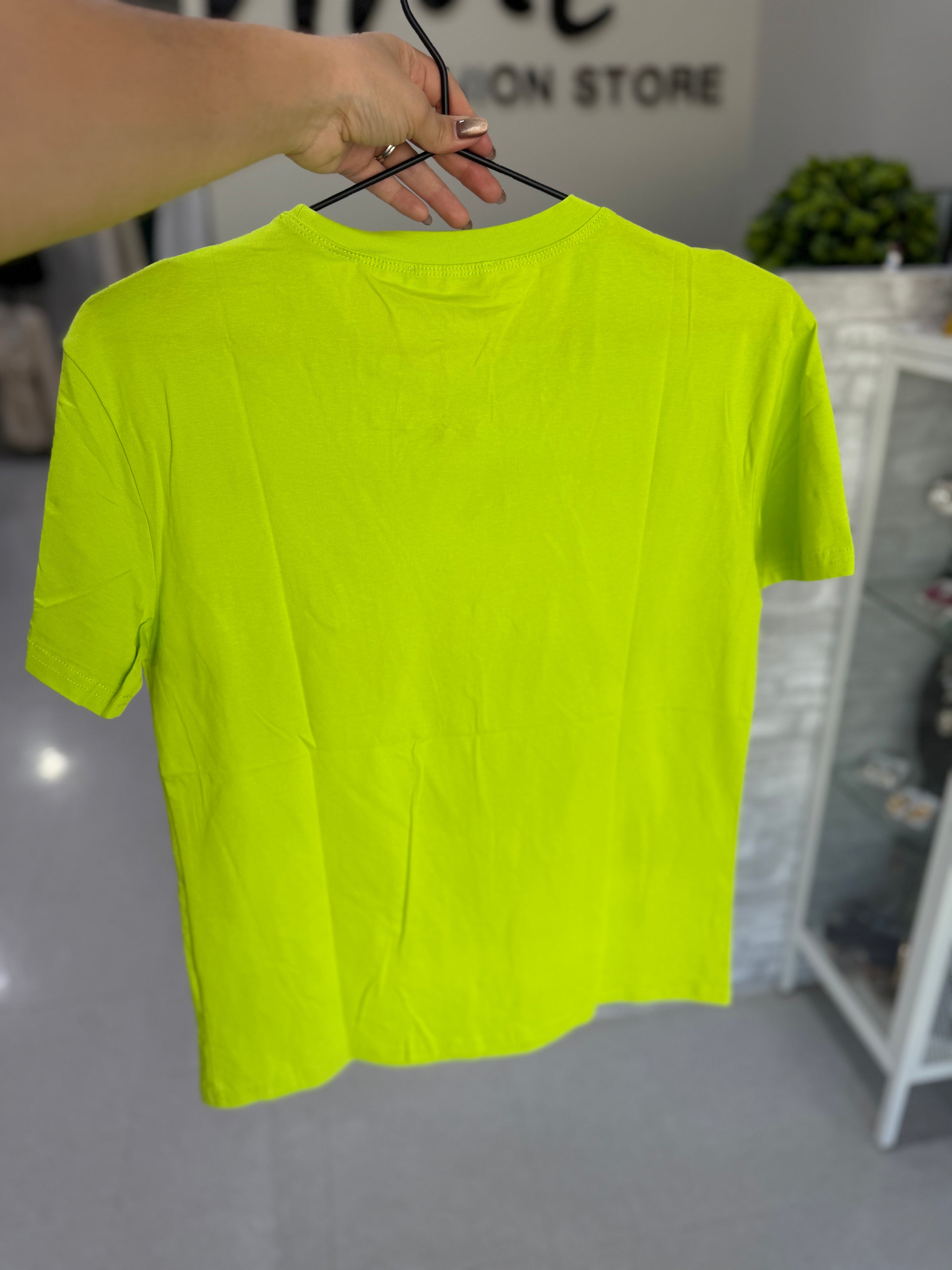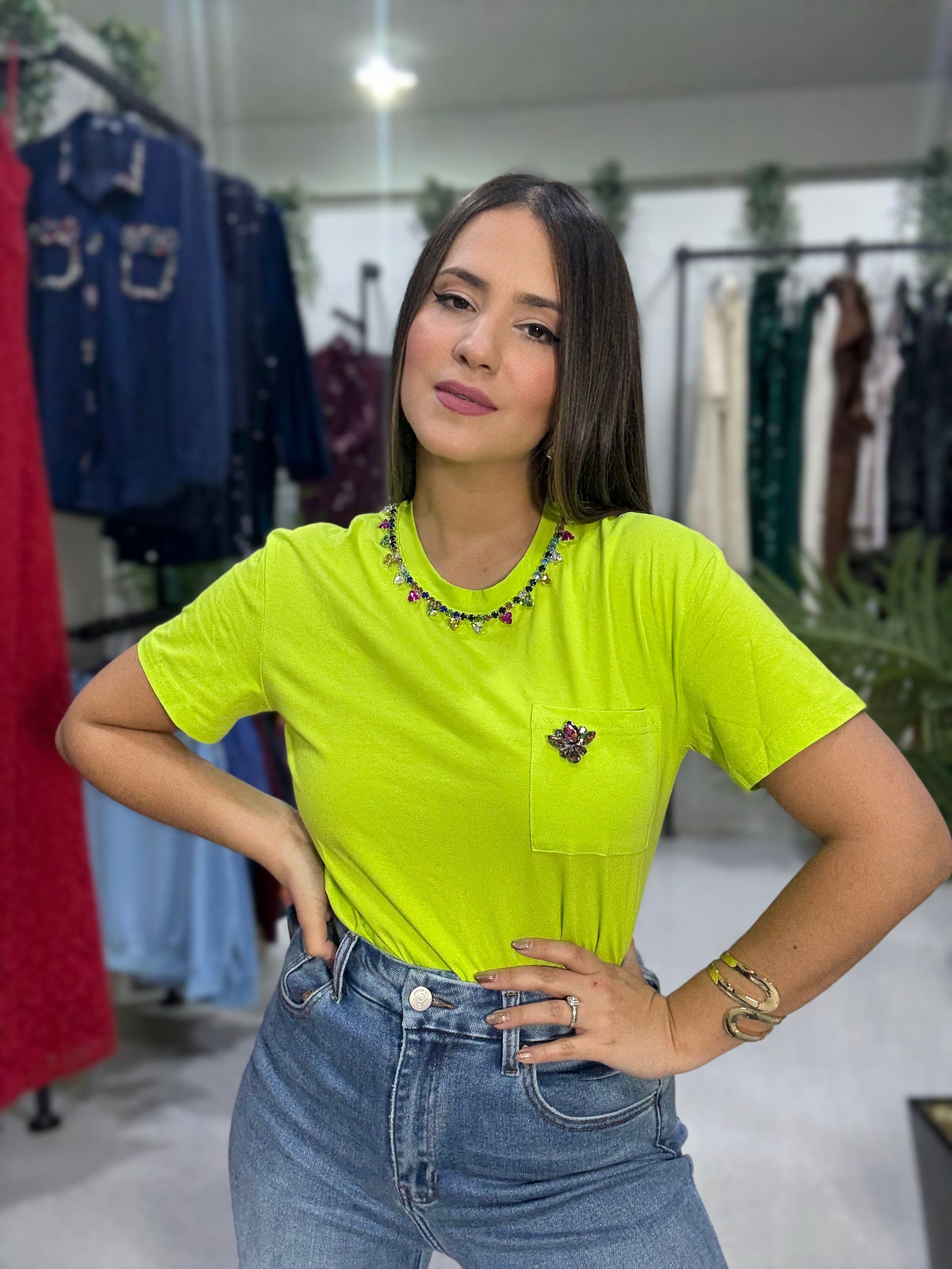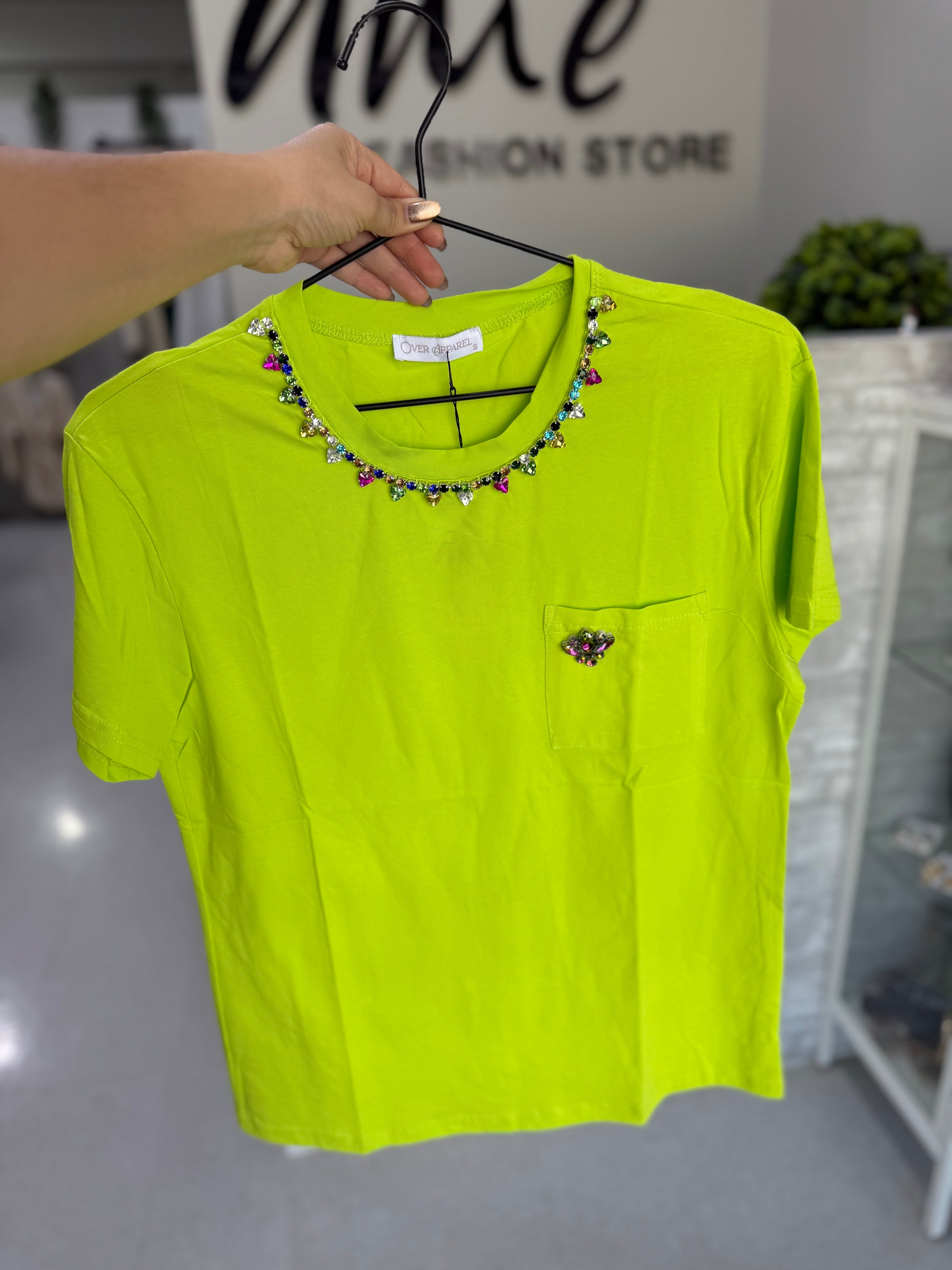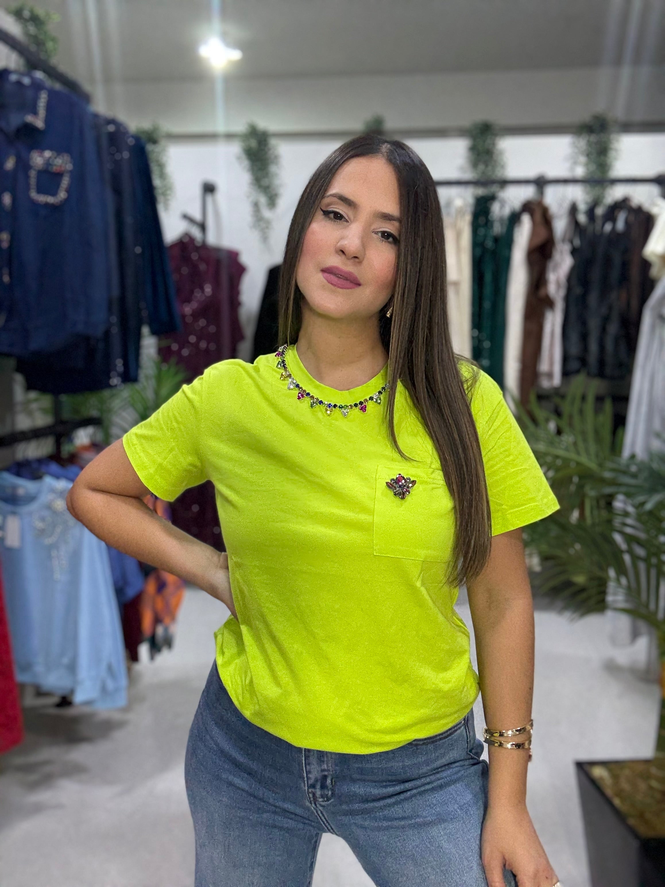 T-shirt con pedrería colorida en cuello en distintos colores. Tipo tshirt en color verde neón. Bolsillo con rhinestones. Largo a la cadera, tela spandex. Corre al size.