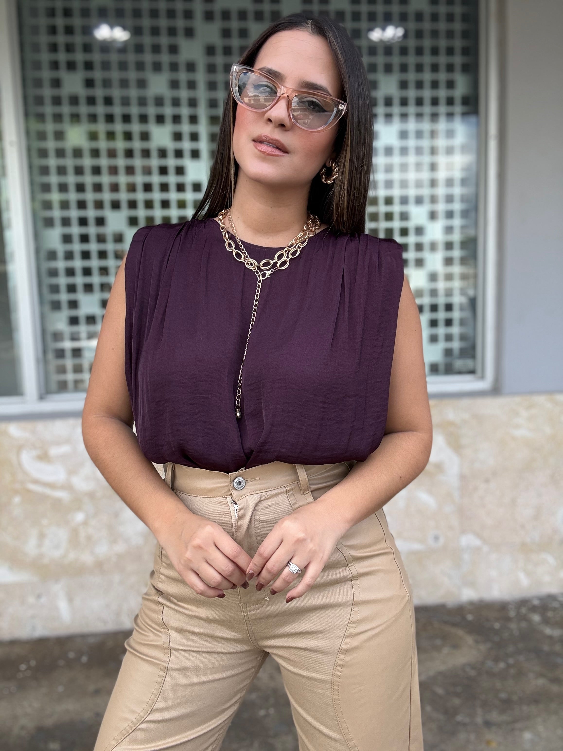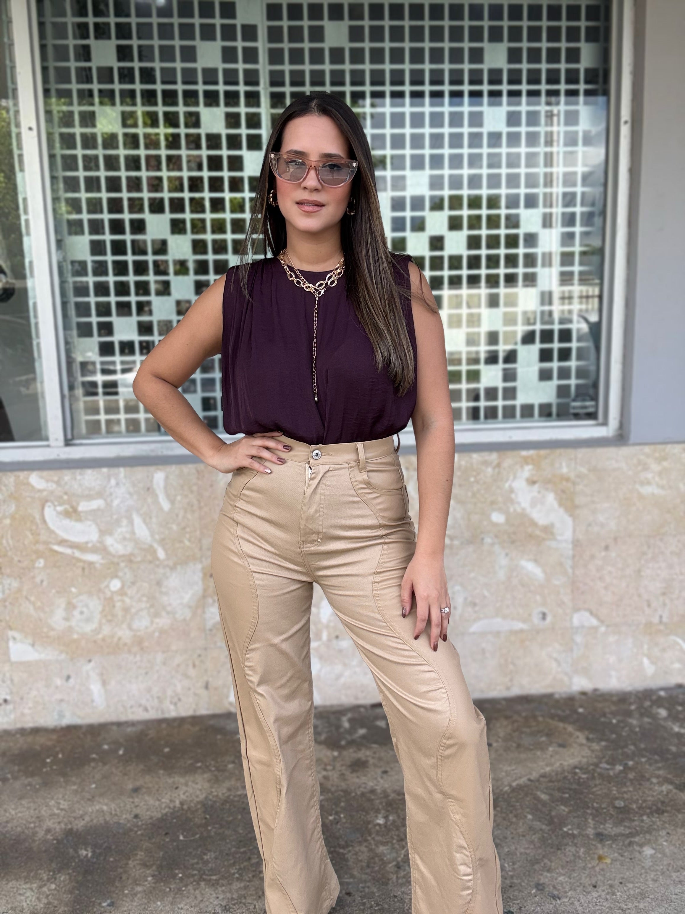 Pantalon en mezcla de textiles color taupe con detalles en curvas con costuras. Centro del pantalon en denim spandex y lados en leather spandex. Estilo tipo wide leg. Corre ajustado, pero la tela estira. Modelo usa talla medium.